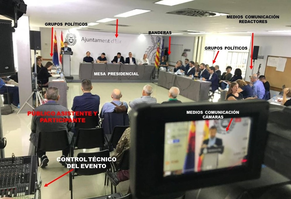 - TÉCNICO. La microfonía de mesa, lamentablemente no permitió que los cables de los micros se pudieron esconder, debido a que si se recogían era dificultoso moverlos para el uso de la palabra, y si se colocaban por delante de los comparecientes, estos se tropezaban al sentarse, y al tratarse de una cesión de mobiliario, no se le puedo agujerear los manteles para colocarlos discretamente. La sonorización de la sala, y colocación de varios patch de prensa para los medios y la retransmisión en streaming a través del Canal YouTube del Consistorio.