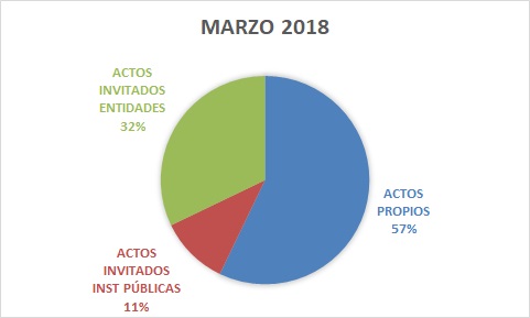 En las siguientes infografías he extraído la actividad del gabinete en los meses de febrero, marzo y abril de 2018. En los cuales gestionamos un total de 120 eventos, en el cual abarcamos una gran diversidad de eventos que clasificamos en 3 categorías de actuación/participación por parte del gabinete de protocolo: