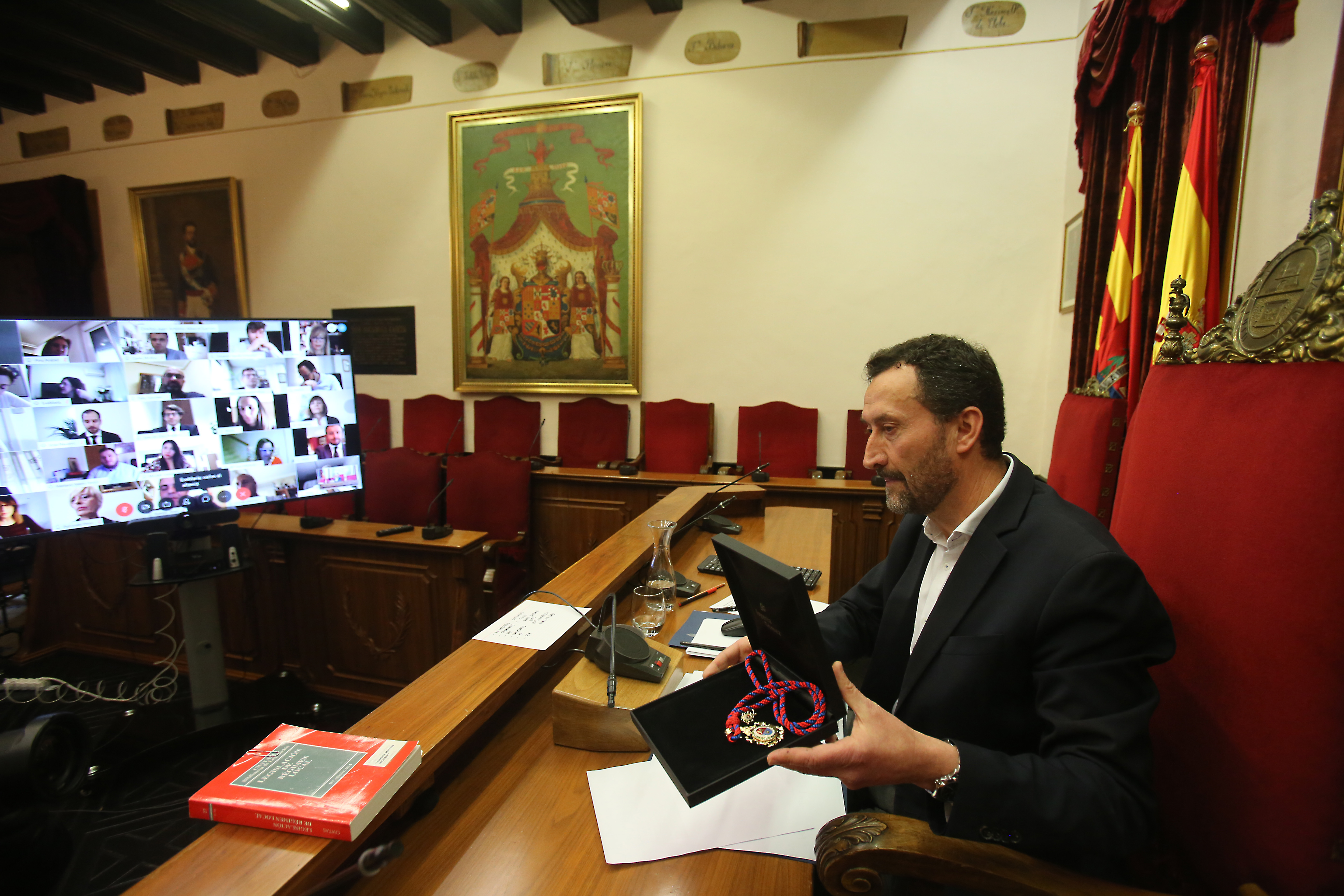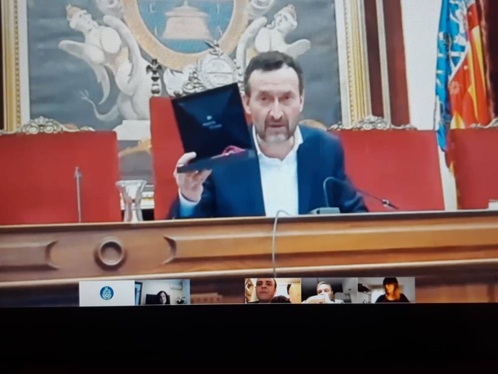 - Tras la lectura, el sr. Alcalde de la ciudad a mostrado a cámara la medalla de la corporación como gesto simbólico de imposición como concejal del Excmo. Ayuntamiento de Elche para la legislatura 2019-2023 (de modo telemático). Al mismo tiempo que le dirigía las siguiente palabras: «Sr. Alberdi, le hago entrega simbólica de esta medalla que atestigua su pertenencia a la Décimo Primera Corporación Municipal del Ayuntmamiento de Elche y su compromiso con el pueblo ilicitano«.