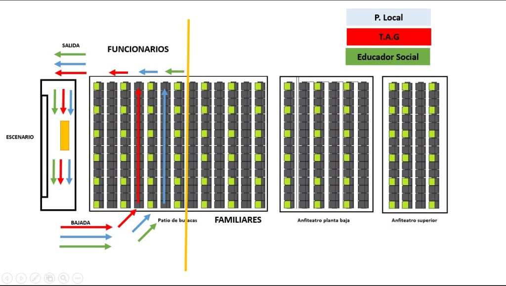 -Ubicar a los funcionarios en el patio de butacas dejando una fila libre en el patio de butacas entre ellos, por supuesto, el acceso de todos ellos se ha realizado por el lado derecho del escenario y lo han abandonado por el lado izquierdo.