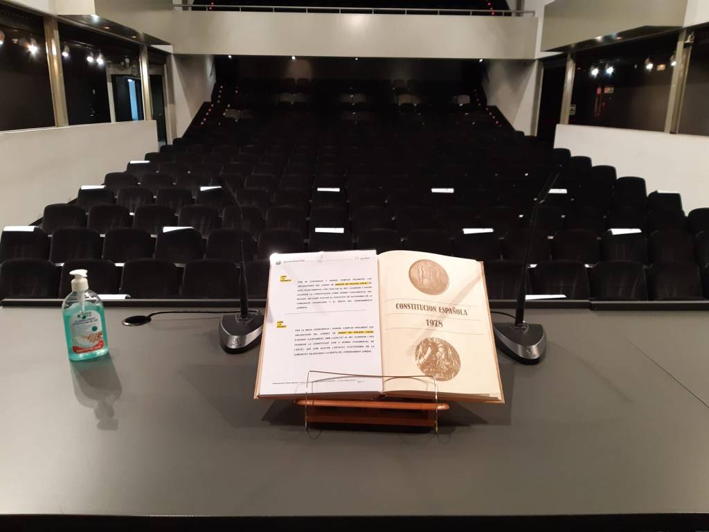 2º JURA O PROMESA DEL CARGO: De nuevo para evitar contactos, el texto de jura o promesa ha sido plastificado para su fácil desinfección en cada nombramiento, evitado en la medida de lo posible el contacto con el objeto. De todos modos, cada funcionario ha realizado de nuevo la desinfección de manos y ha dejado su mano suspendida en el aire, lo más cerca posible de la Carta Magna pero sin llegar a tocarla.