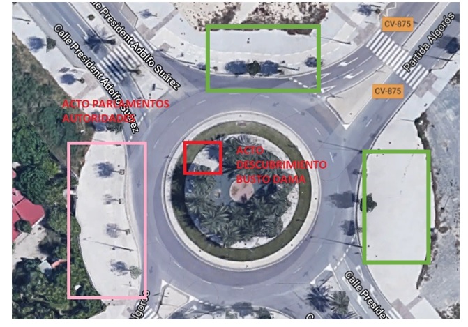 Debido que es una vía con una afluencia significativa de tráfico, se optó por cortar el mismo en los momentos puntuales del acto: descubrimiento del busto de la Dama de Elche y en las consecutivas fotos de familia) con el fin de no interferir en el tráfico ( por supuesto contamos con la colaboración de la Policía Local de Elche para esta tarea).