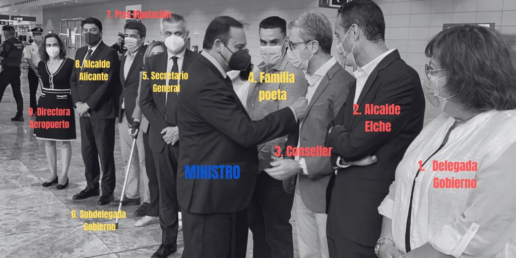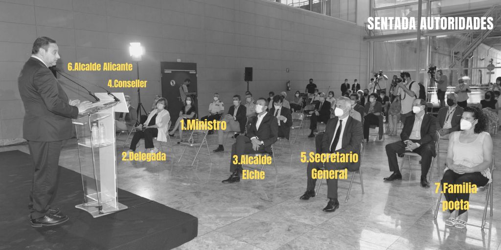 1º fila compuesta: 1. Ministro, 2. Delegada del Gobierno, 3. Alcalde de Elche, 4. Conseller de Movilidad, 5. Secretario General de Agenda Urbana, 6. Alcalde de Alicante y 7. Familiares del poeta.