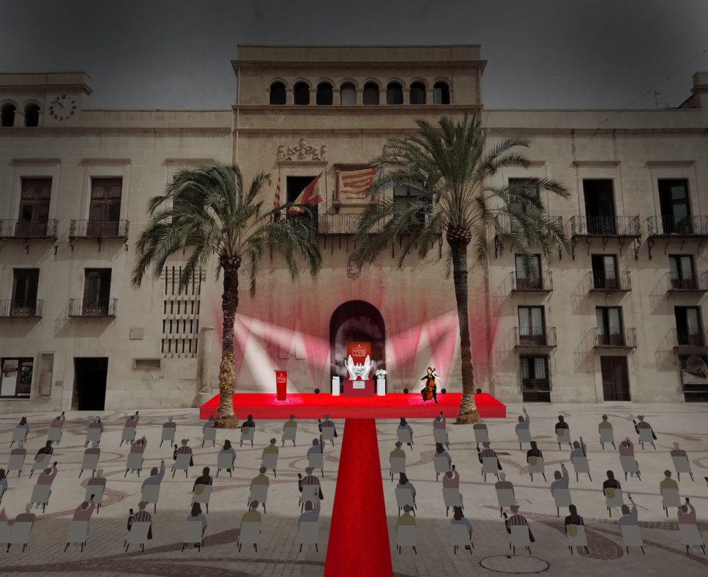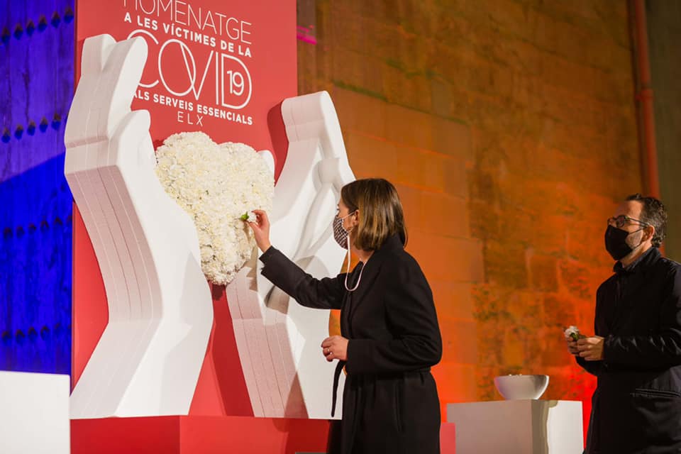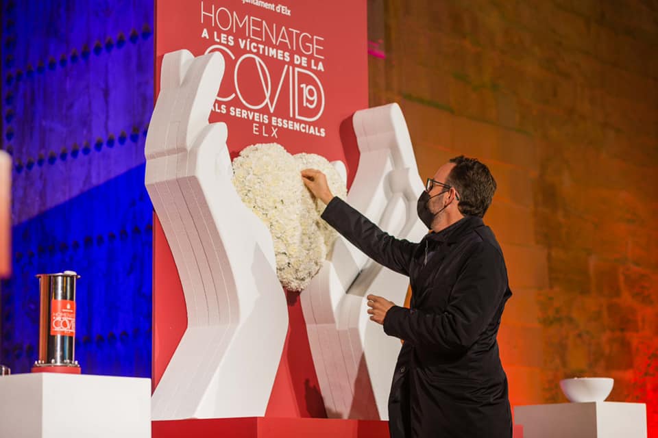 No hay escenografía más emblemática para un ilicitano que la Plaça de Baix ( plaza principal de la ciudad) pero había que equiparla con un escenario institucional y elegir la paleta de colores ( blanco y rojo) acorde con el mensaje que se quería transmitir: sobriedad, respeto, elegancia…etc. Y para ello se elaboró una escultura efímera. Unas manos que se alzan al cielo, unas manos que aplauden, que cuidan y protegen la vida, y que además de ser el foco visual central del invitado, también la utilizaríamos para uno de los momentos de mayor respeto, la ofrenda floral en memoria de los fallecidos.