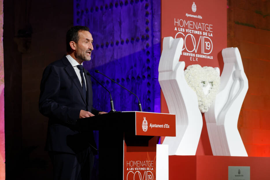 El Acto Institucional de Homenaje de la ciudad de Elche a las víctimas de la Covid19 y Servicios Esenciales se inició con el discurso institucional del alcalde de la ciudad, Carlos González, como máximo representante de los ciudadanos