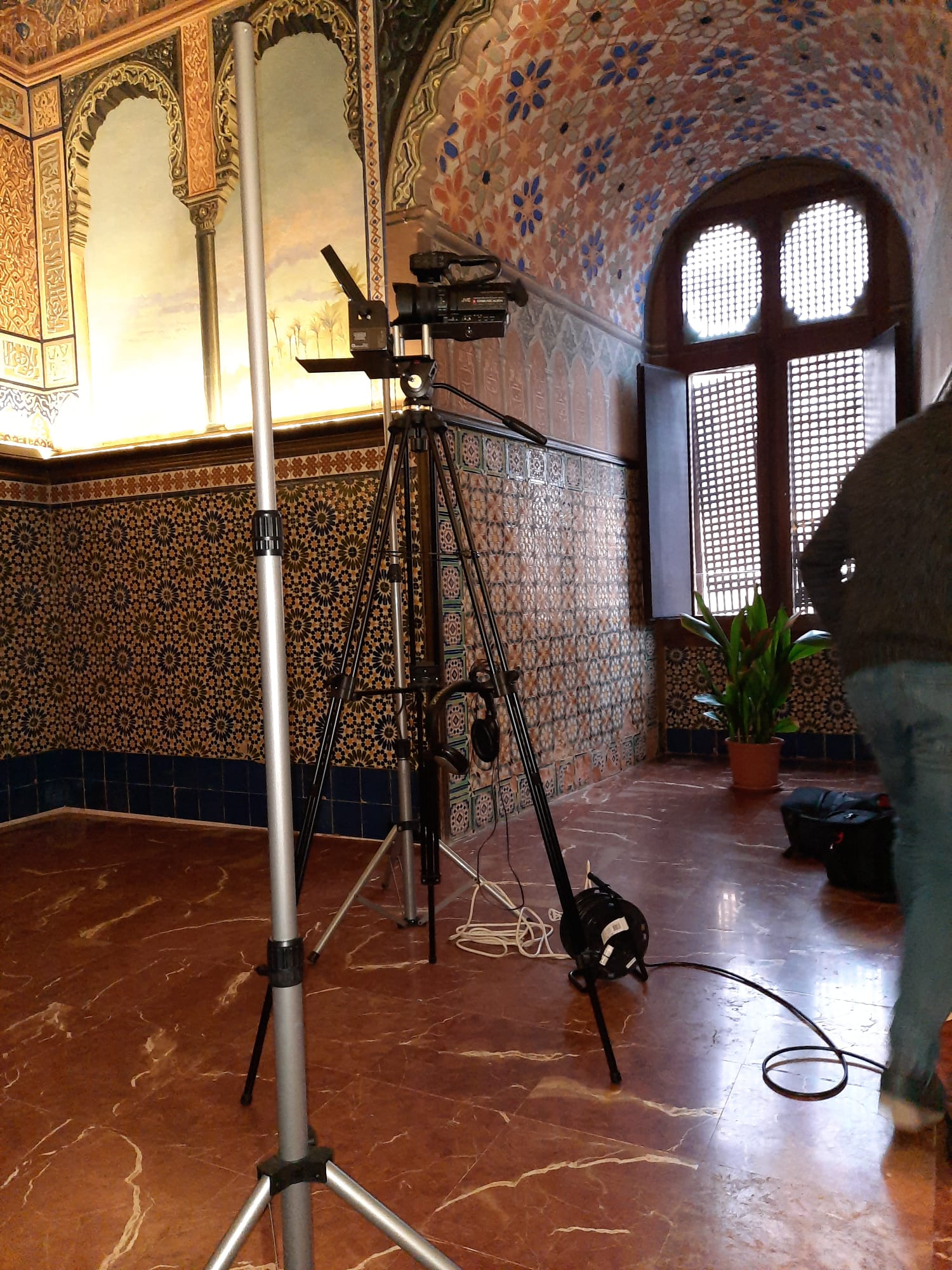 En cuanto a los elementos que conforman el conjunto escenográfico y teniendo en cuenta la carga plástica de la sala, la tendencia fue apostar por ser lo más minimalista posible, es decir, con los menores números de elementos, por tanto incluimos las banderas institucionales y un centro de flores de Pascua, como guiño y reconocimiento de la época del año en la que se graba este discurso institucional.