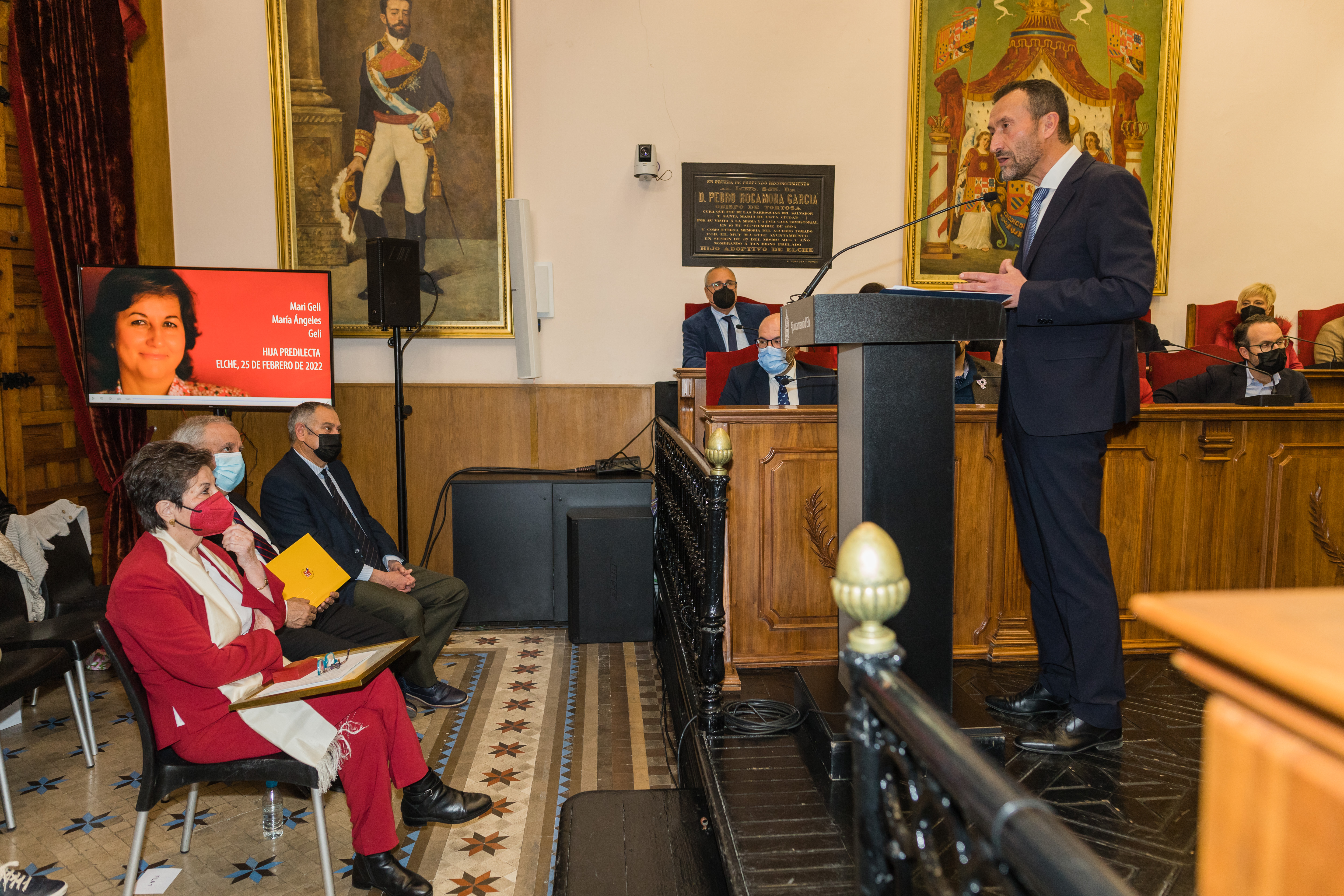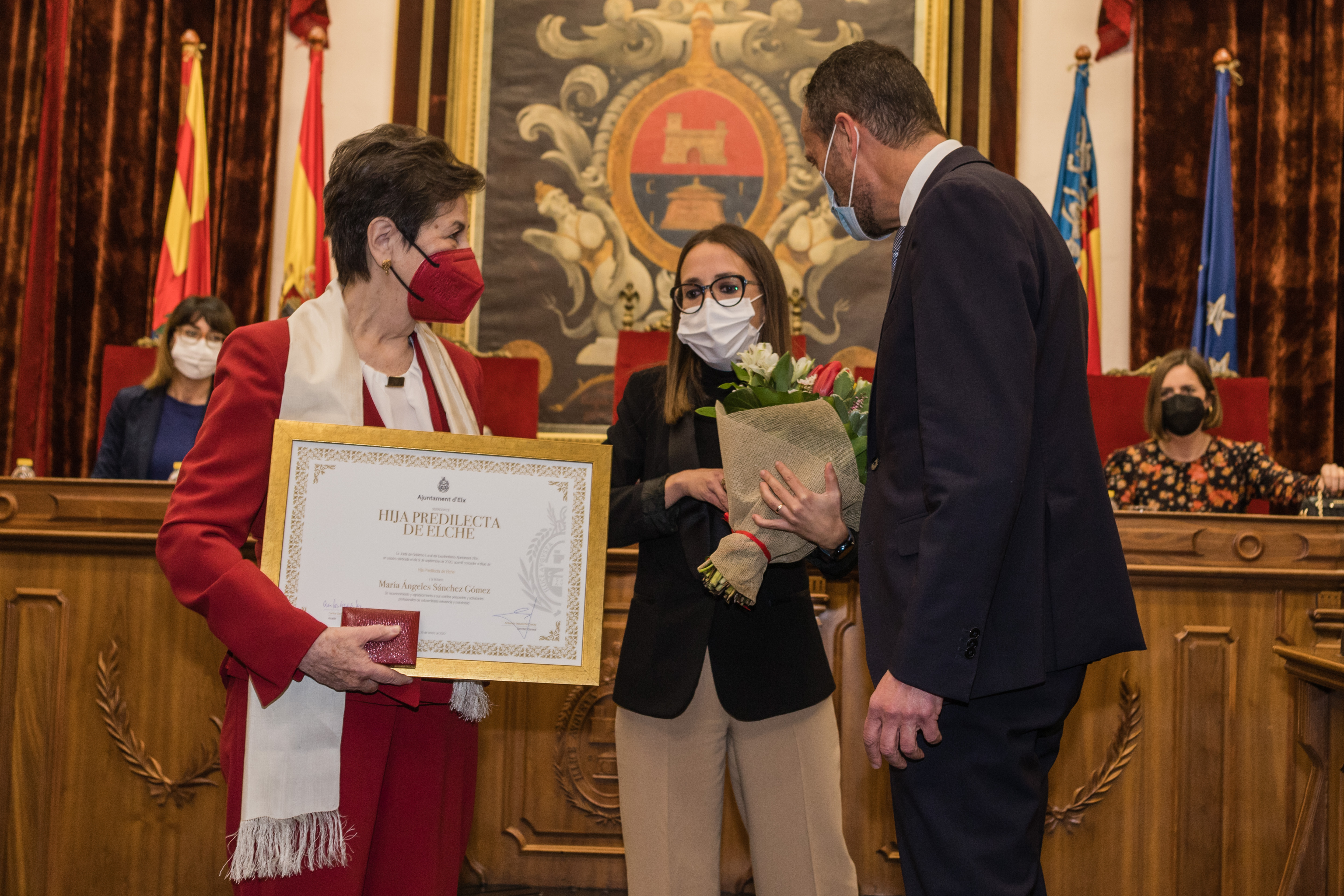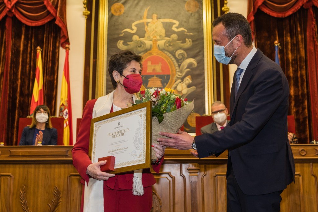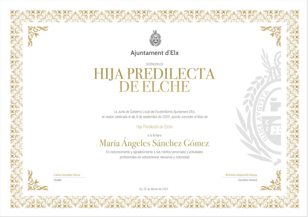 El Secretario General del Ayuntamiento de Elche es la persona encargada de dirigir el Acto de Nombramiento como Hija Predilecta de Elche de Dña. María Ángeles Sánchez, en esta ocasión la hija predilecta solicitó que su Laudatio fuera realizada por dos personas, el profesor e historiador, Miguel Ors, y el periodista Gaspar Maciá, además complementó esta laudatio a dos, con una laudatio virtual con testimonios de compañeros destacados de profesión.