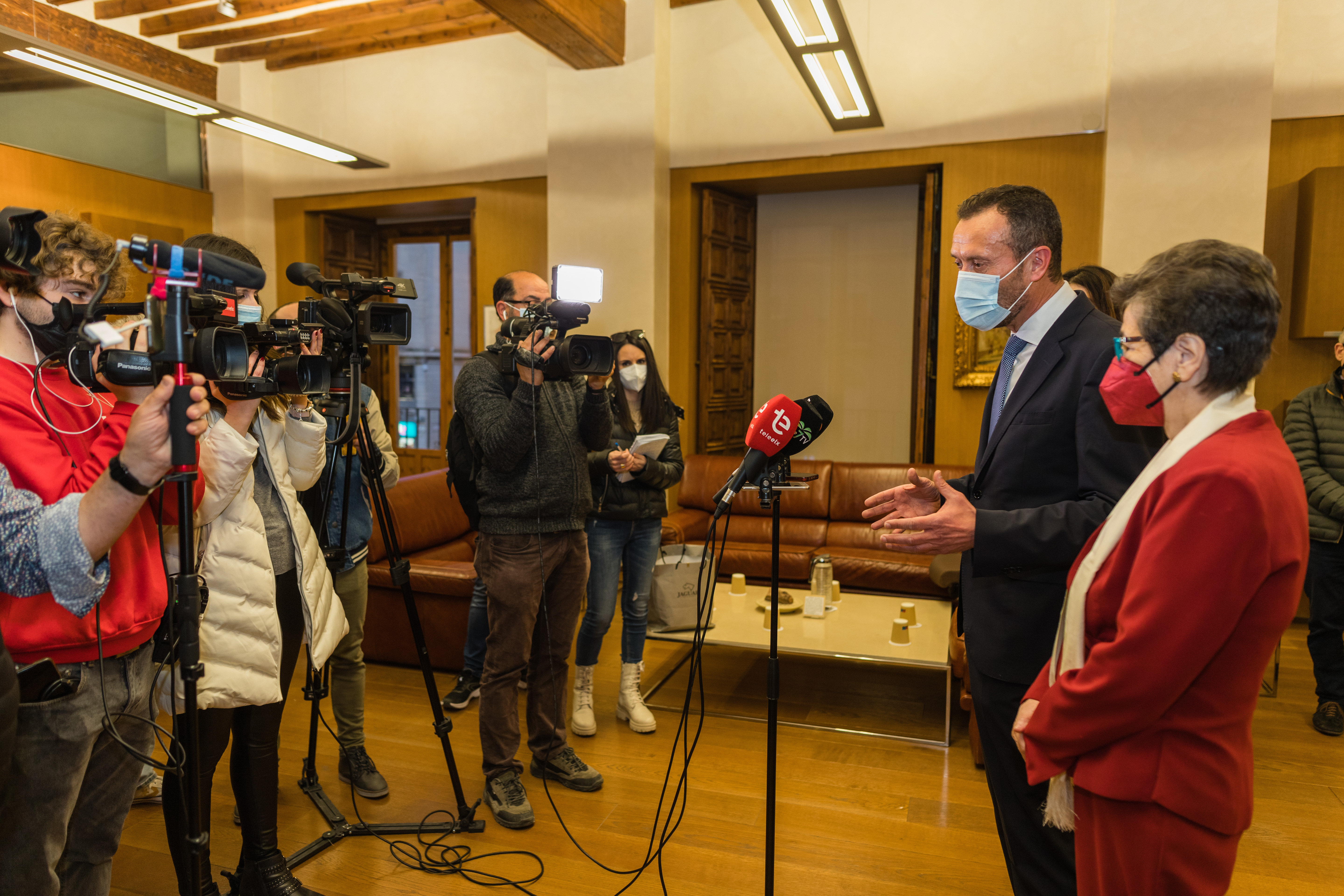 Tras plasmar y leer su texto, la Hija Predilecta y el alcalde de la Ciudad, atienden a los medios de comunicación.