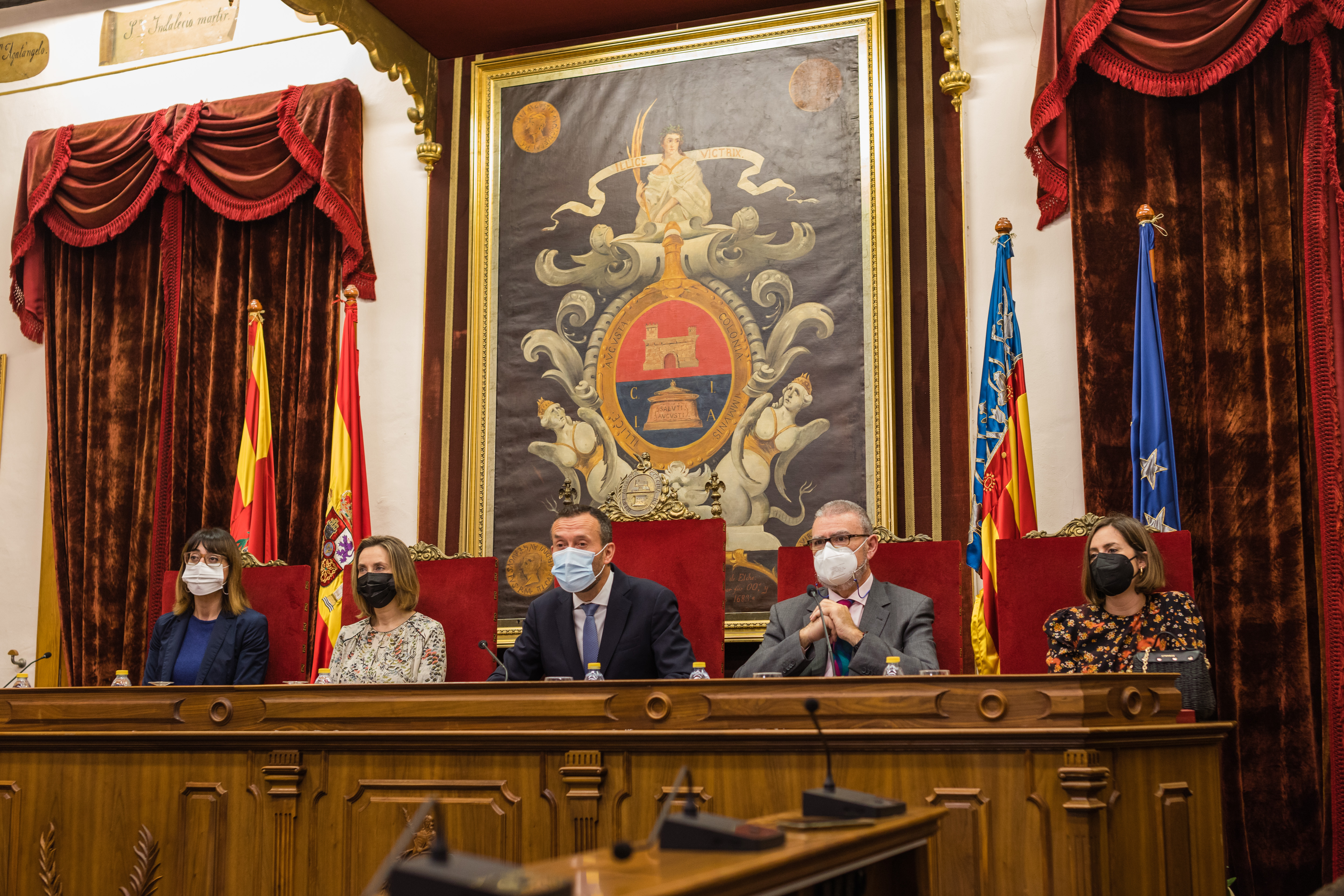 Seguidamente, el Secretario General del Ayuntamiento de Elche, Antonio Izquierdo, invita al centro del estrado al alcalde de Elche, Carlos González y a la Hija Predilecta para hacerle entrega del título que le atribuye como la Primera Hija Predilecta de Elche junto con la insignia.