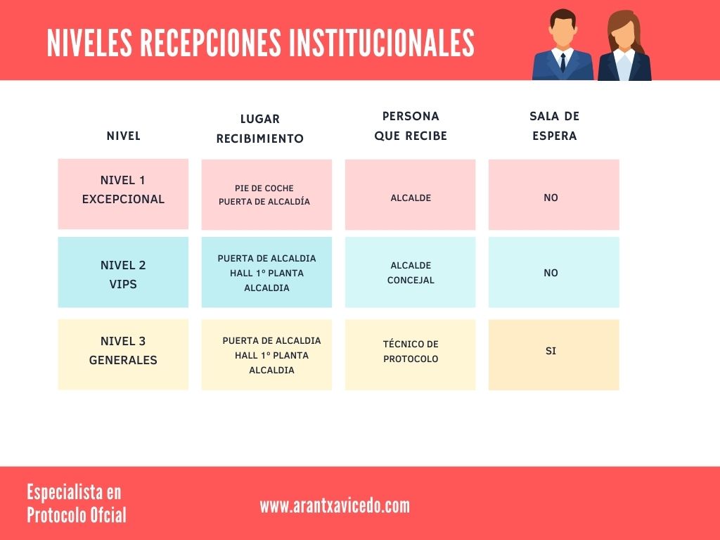 Como puedes observar en el siguiente esquema las recepciones las clasificamos en 3 niveles de atención protocolaria dependiendo del tipo de invitado que se reciba. En cuanto a la duración de este tipo de actos no suele superar la hora de duración.