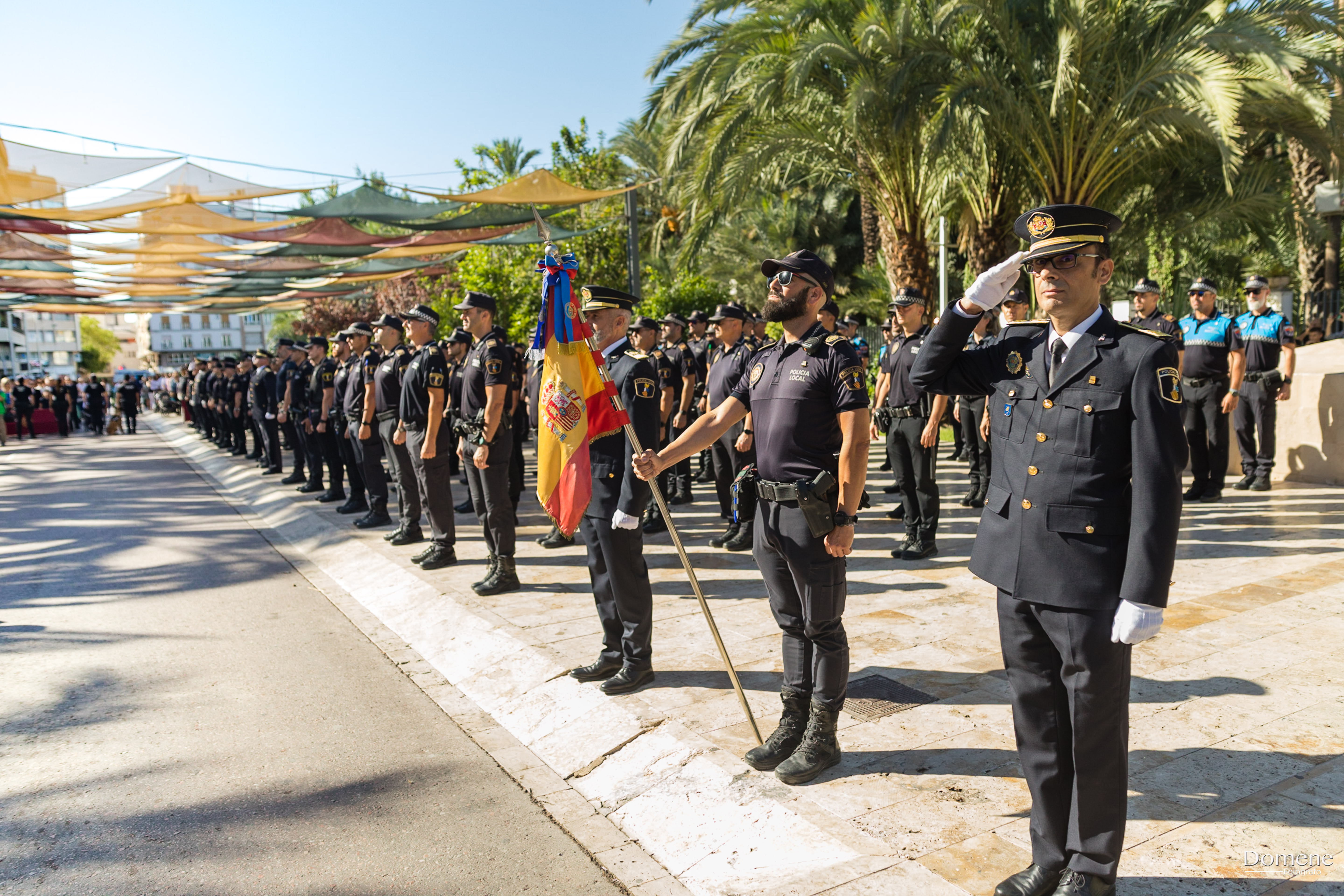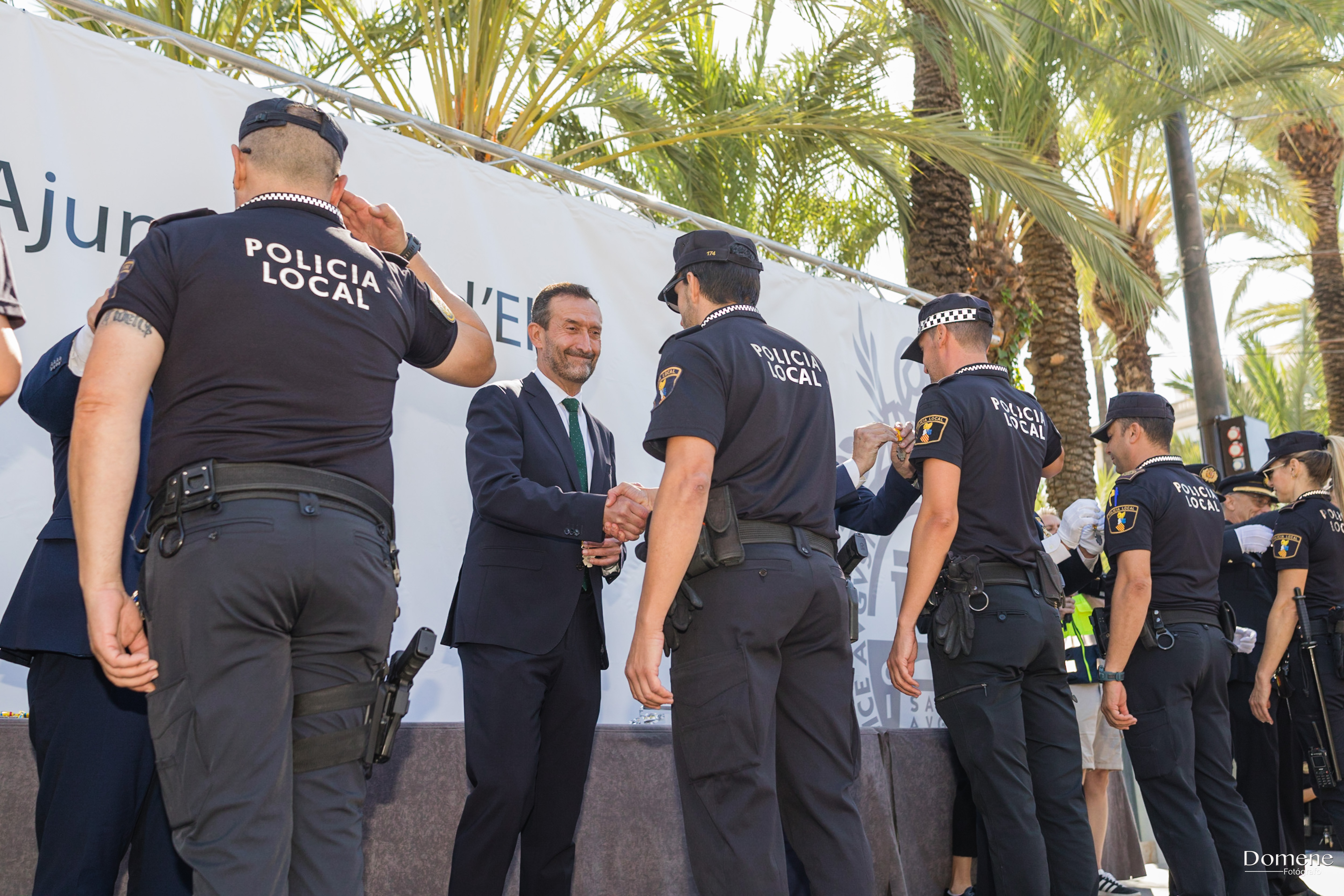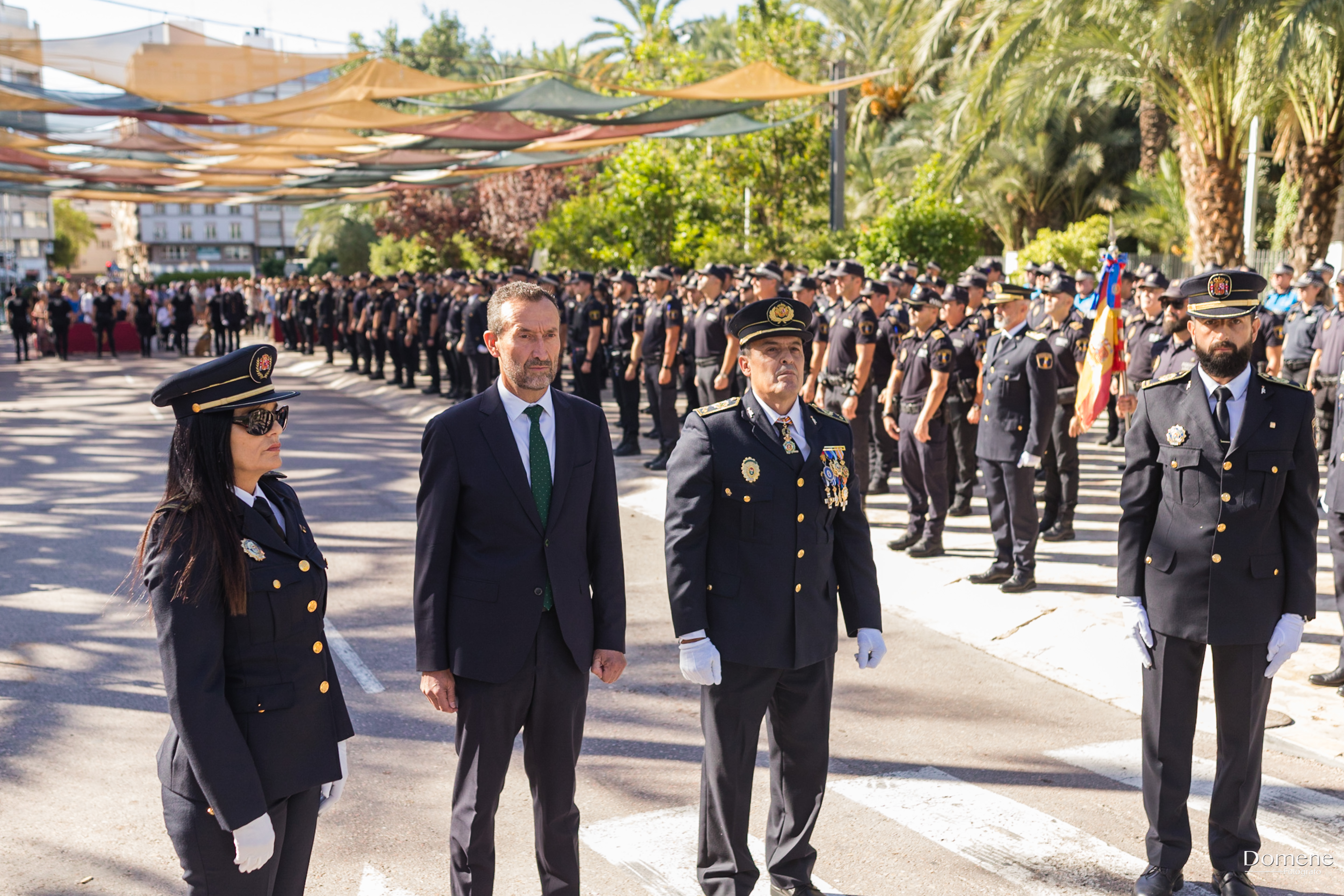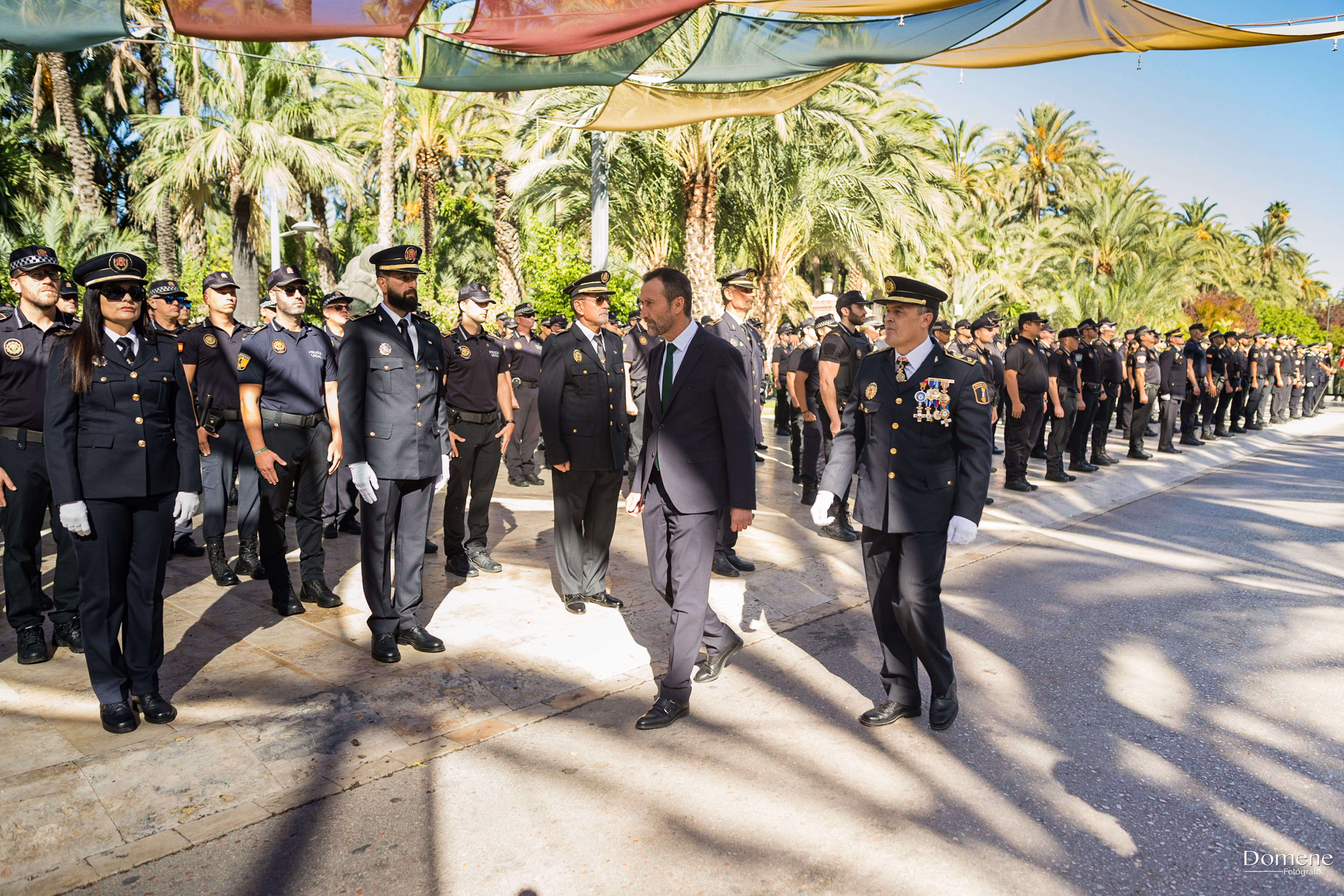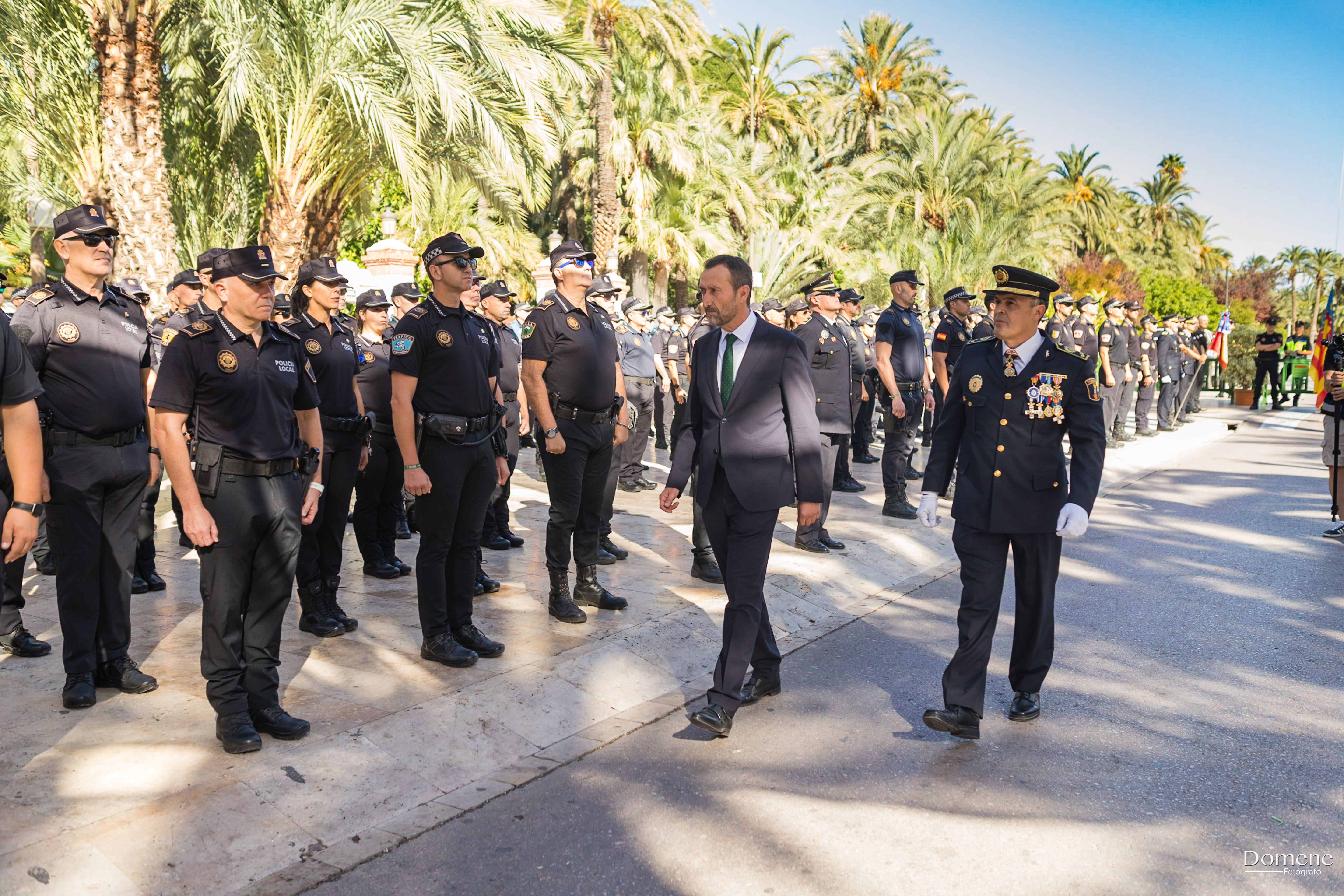 - A continuación, el alcalde de Elche, Carlos González y el Comisario Principal Jefe, César Zaragoza, revisan la formación (horizontalmente), mientras tanto, Ramón Abad, edil de Seguridad Ciudadana, les espera a pie de escenario.