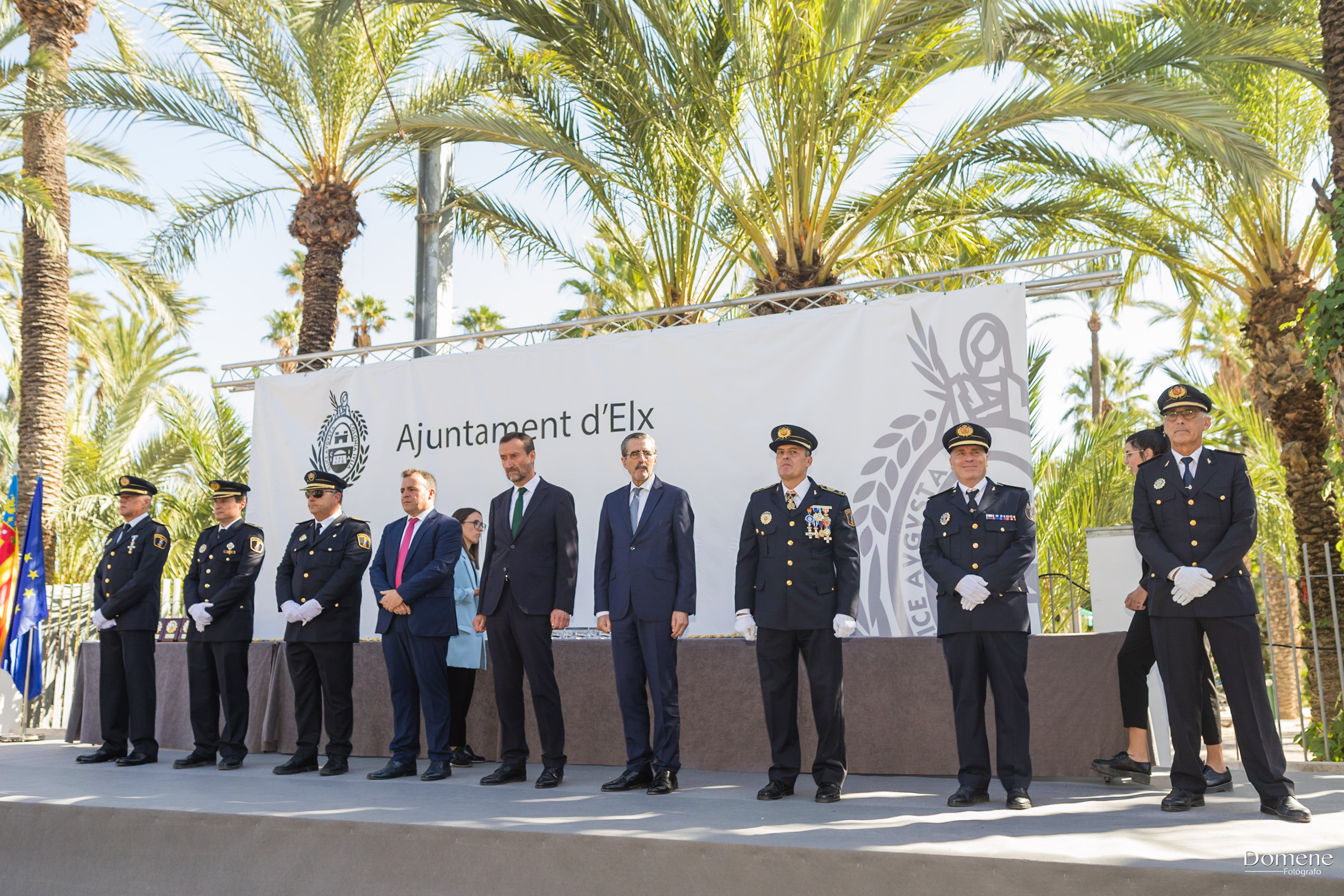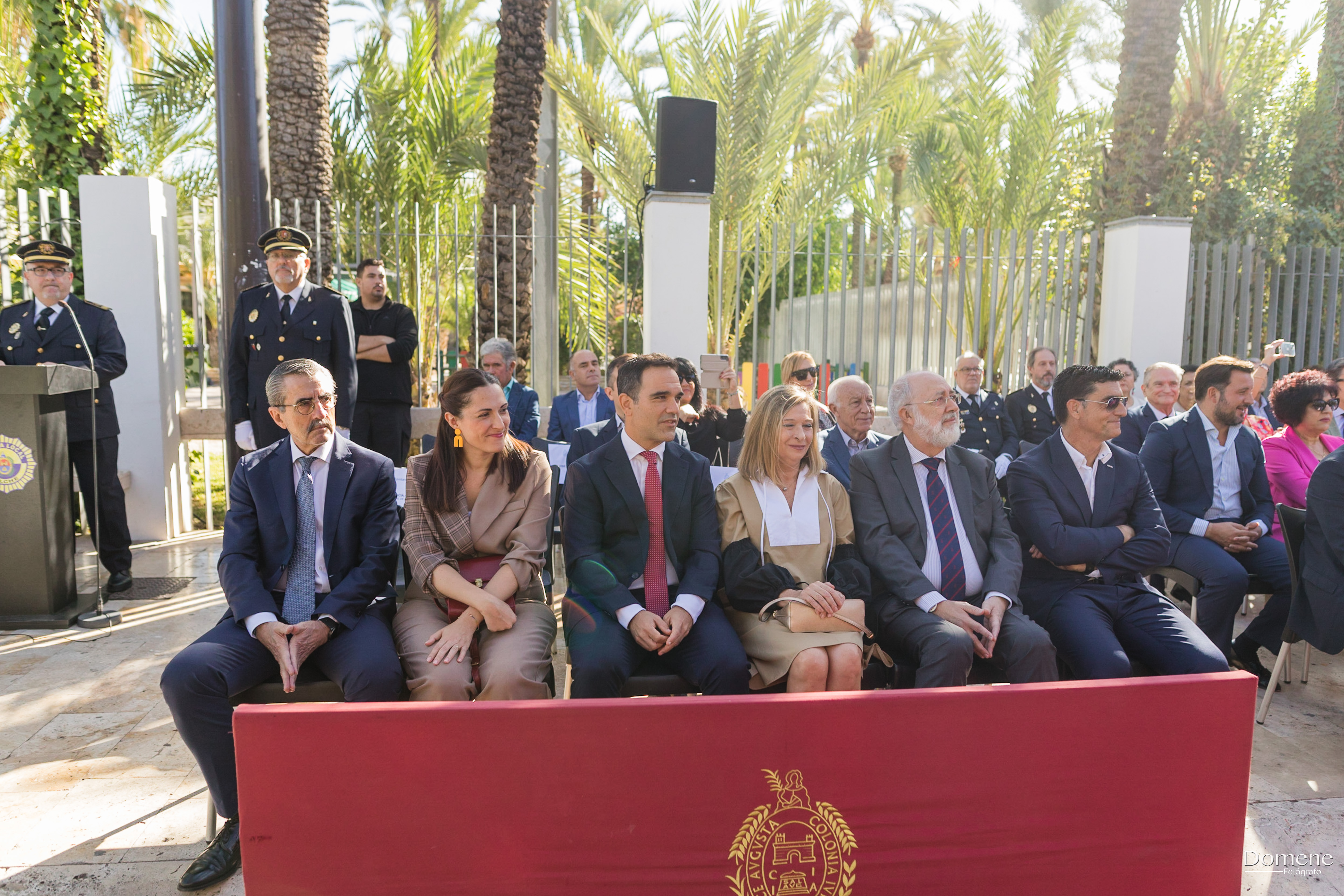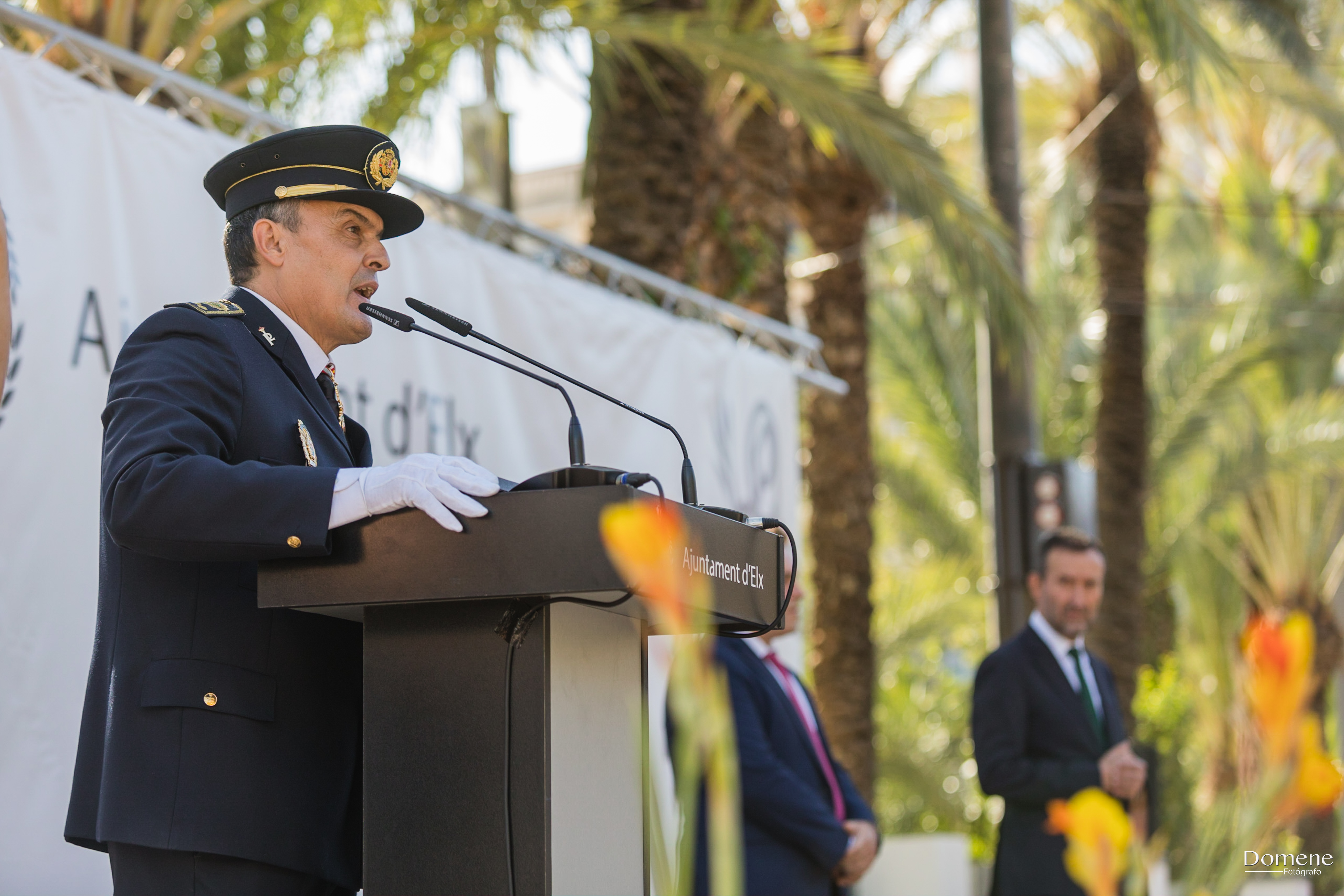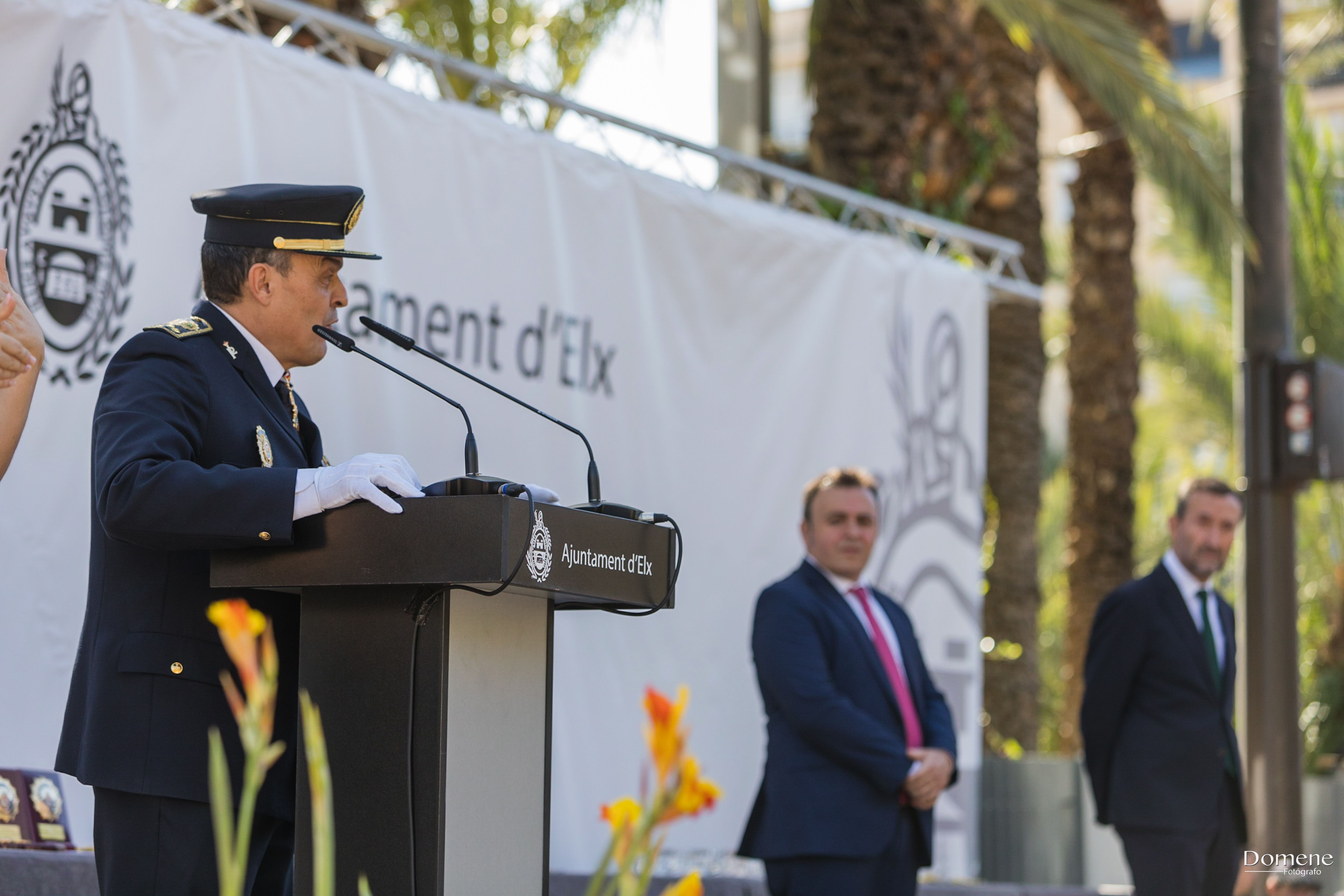 - El acto se inicia con la presencia de Carlos González, alcalde de Elche, Ramón Abad, Concejal de Seguridad y César Zaragoza, Comisario Principal Jefe (relata lo que va sucediendo un presentador/relator).