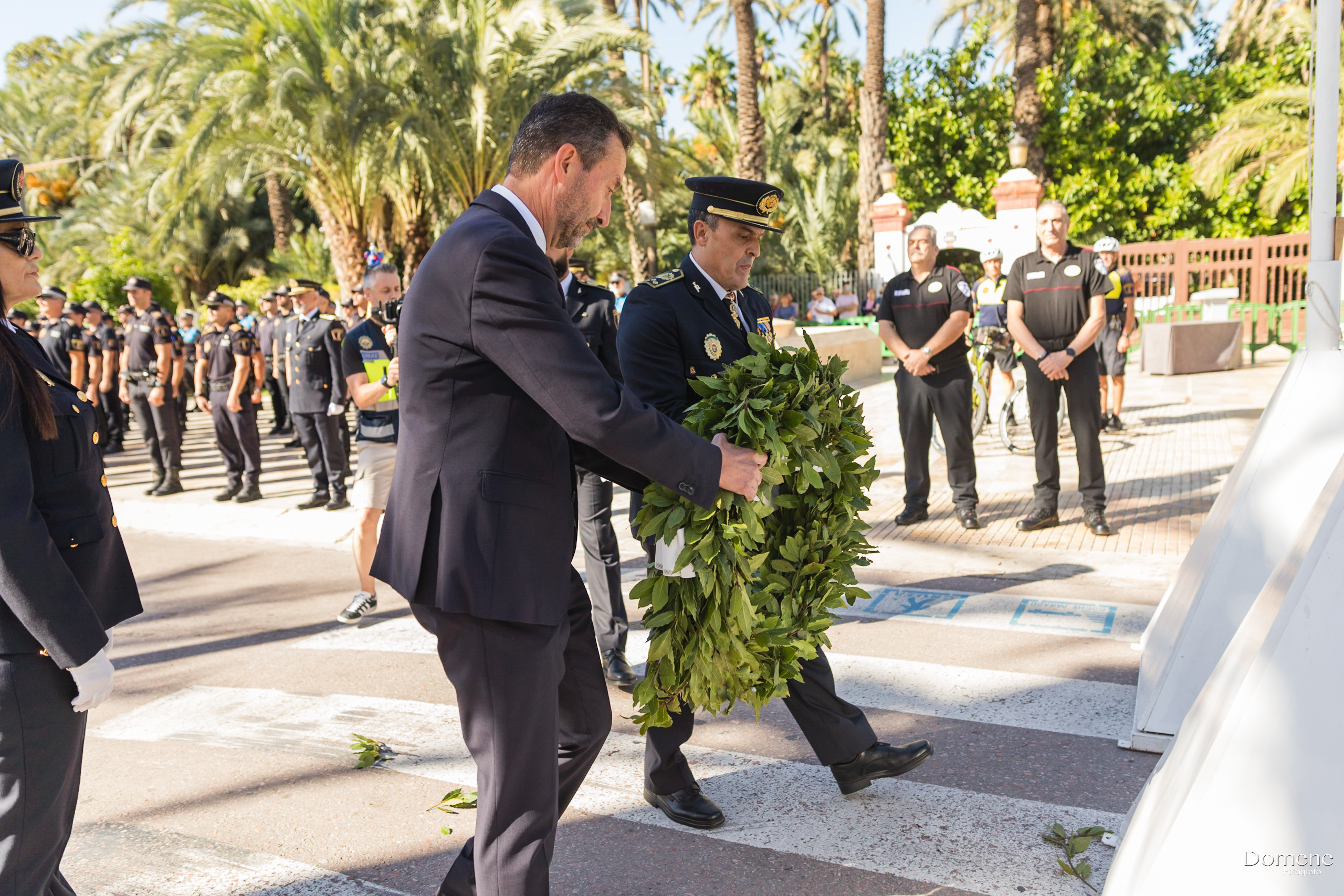 - De nuevo el presentador anuncia la presencia de la “corona de laurel” que será́ portada por dos agentes (hombre y mujer) como gesto de homenaje a los caídos, tras los agentes el Alcalde y el Comisario principal Jefe, depositan la corana en el pie de los mástiles de las banderas.