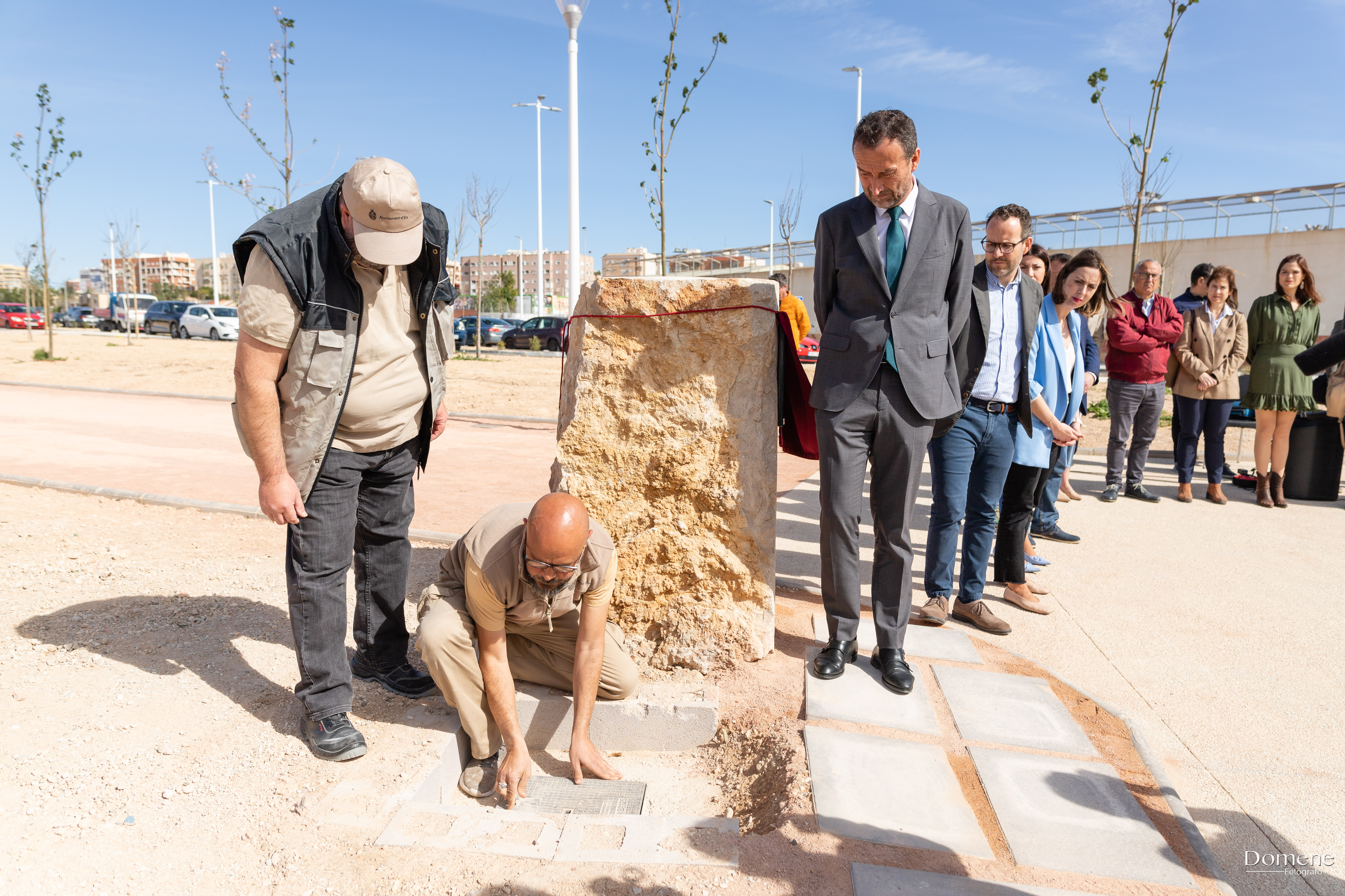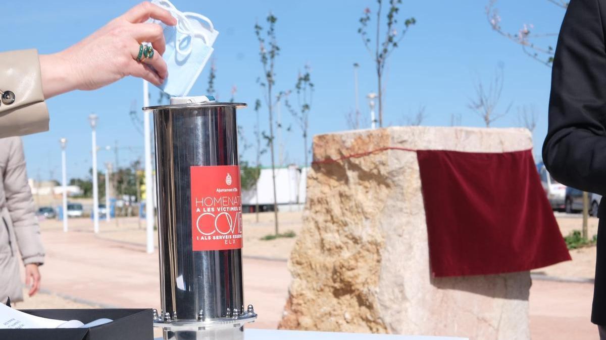 Un monolito conmemorativo y una cápsula del tiempo han sido los dos elementos escenográficos del acto de inauguración del Jardín en Homenaje a las víctimas del Covid-19 en Elche.