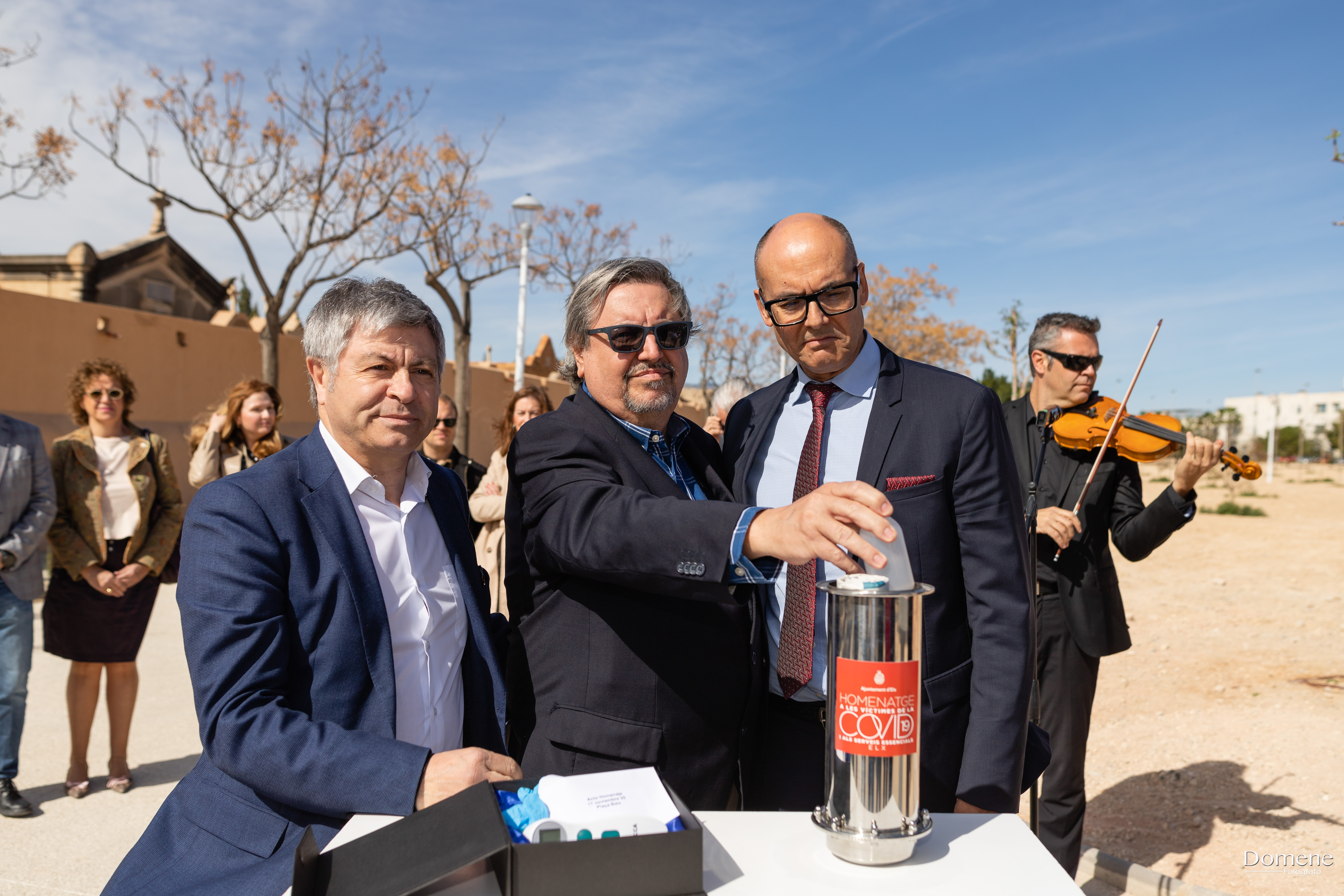 Tras los testimonios, el alcalde de la ciudad con ayuda de los dos portavoces del gobierno municipal descubrieron la placa conmemorativa «Elche en recuerdo de las víctimas y afectados por la pandemia del COVID-19 y en agradecimiento a las personas que han ofrecido su trabajo y su solidaridad en beneficio de todos los ilicitanos e ilicitanas».