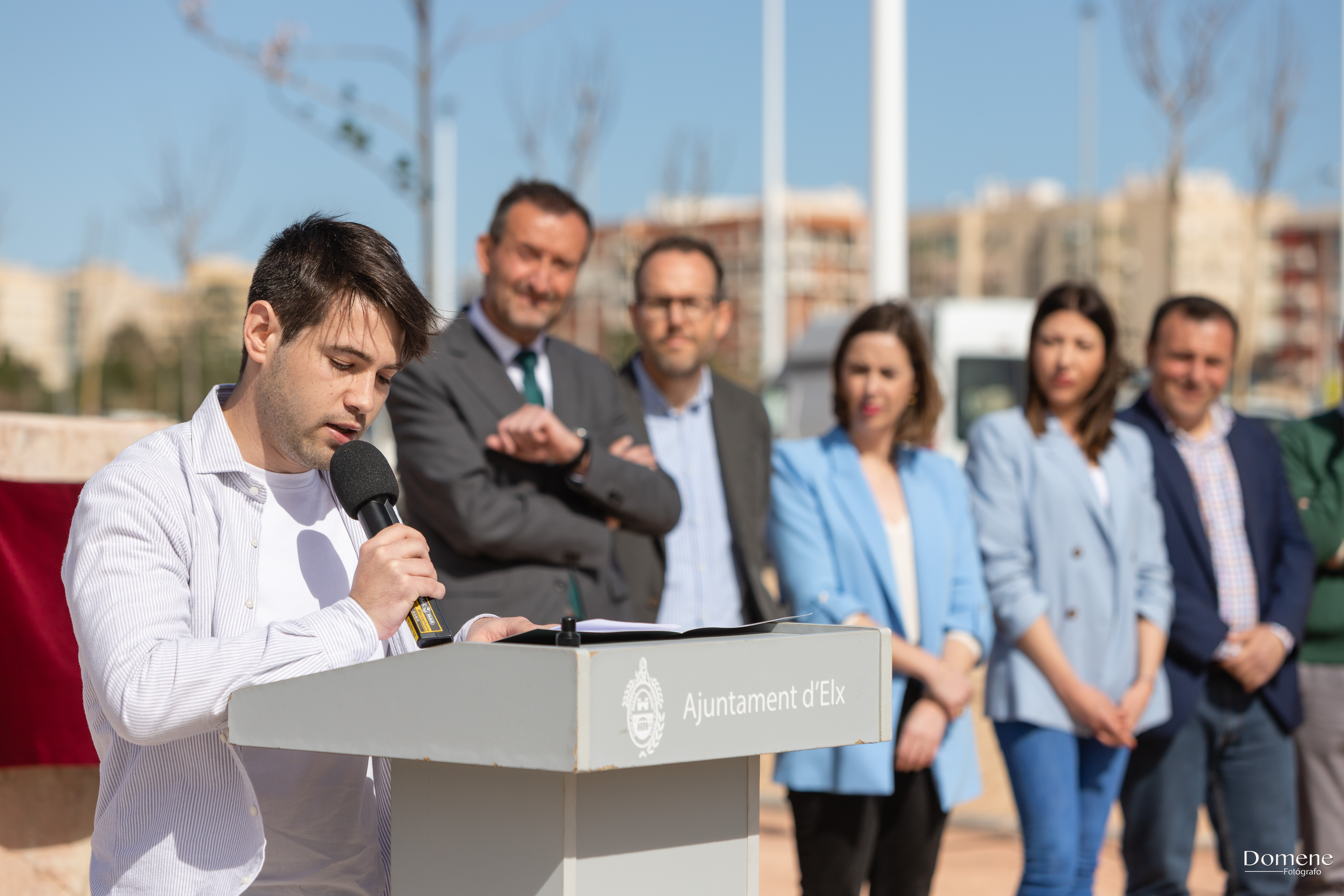 Ubicación de los participantes: en la siguiente galería se observa la colocación de los invitados y participantes, partiendo del monolito como elemento principal a la derecha del observador se colocó la corporación municipal presidida por el alcalde y seguidamente el resto de concejales por su orden, y en la lado izquierdo del observador las personas que participan de un modo u otro en el acto.