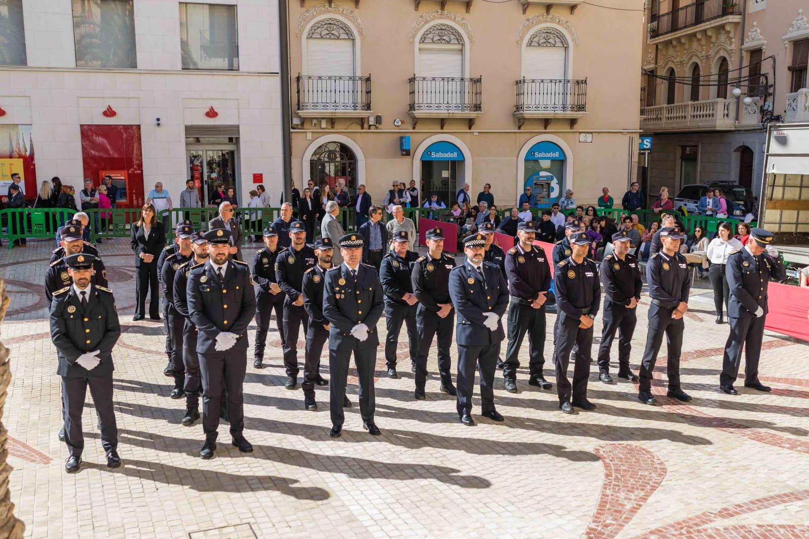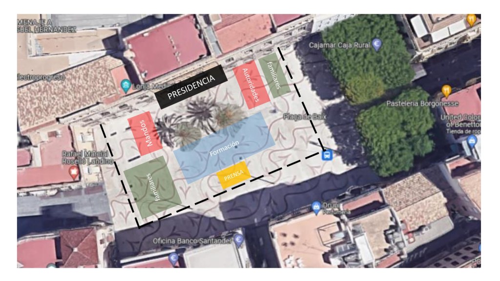 Como puedes observar en la imagen adjunta el elemento principal ( PRESIDENCIA/ESCENARIO) lo centramos a la fachada principal del ayuntamiento, la tarima de prensa se centro a este escenario para que los medios de comunicación pudieran disponer de buena visibilidad sin interferir en la formación, los mandos invitados de las fuerzas y cuerpos de seguridad del estado se ubicaron a la derecha del escenario delimitados por una vallas bajas, y las autoridades a la izquierda, los familiares se colocaron en dos puntos de plaza, y por último, la formación de agentes que recibieron distinción en el centro de la plaza organizados a su vez por categorías.