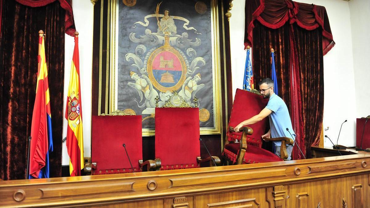 La distribución de los Grupos Municipales en los escaños no es cuestión baladí y tiene que confirmarse previamente al acto, como se puede ver en la imagen, los 4 candidatos alcaldables encabezan sus grupos, con la particularidad de que la candidata 3 a su vez la presidenta de la mesa de edad, por ello se sitúa al inicio del acto en un extremo ( evitar ver sillones vacíos durante todo el acto). En el Ayto. de Elche es tradición que el grupo que obtenga la alcaldía se sitúe a la izquierda del observador desde el patio de butacas.