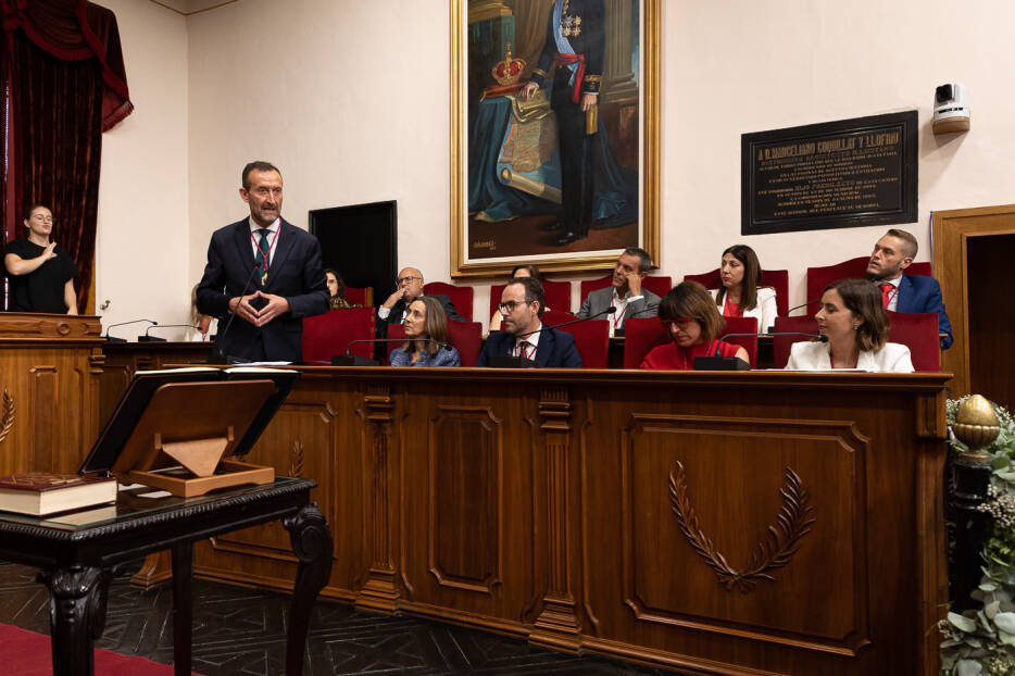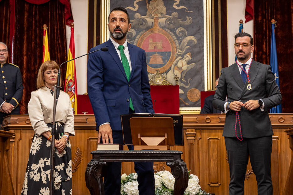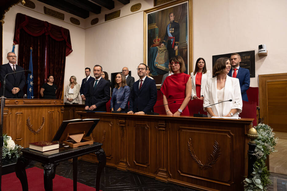 - El ceremonial: Acercándose al centro del escaño, y colocando la mano derecha sobre la constitución jura o prometen el cargo según la fórmula establecida. Aquellos miembros que lo estimaron oportuno juran o prometen el cargo con la biblia. Una vez jurado o prometido el cargo, la Mesa de Edad les impone de modo individual, la medalla de concejal/a de la corporación municipal y queda constituida la misma.