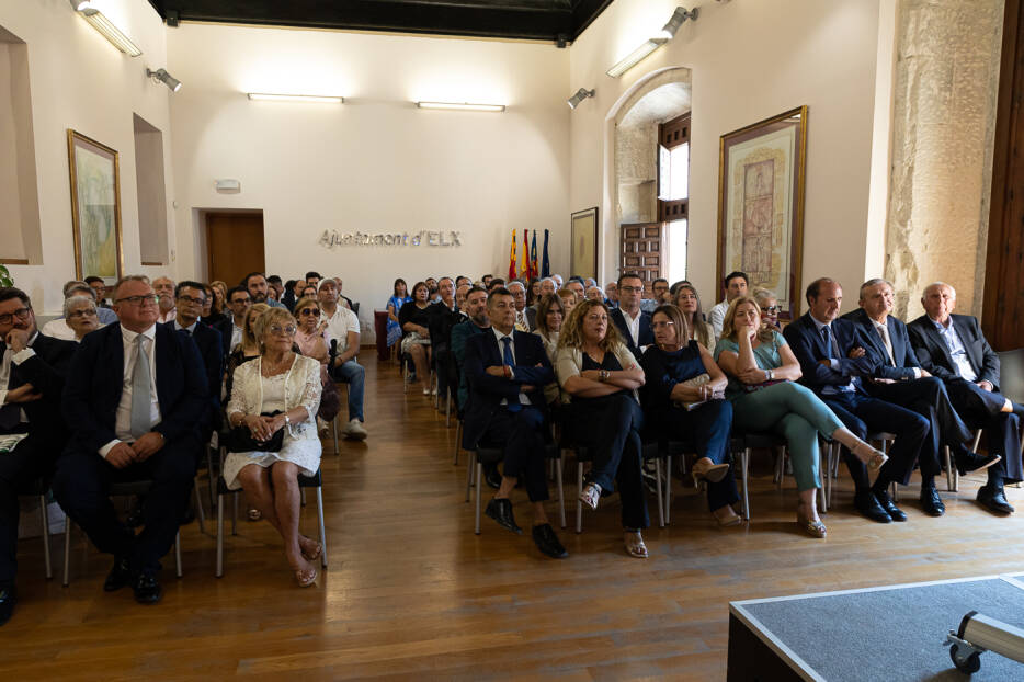 - Con los Concejales situados en sus respectivos asientos, el Secretario General toma la palabra para anunciar que los presentes se ponga en pie para escuchar » El Himno de Elche».