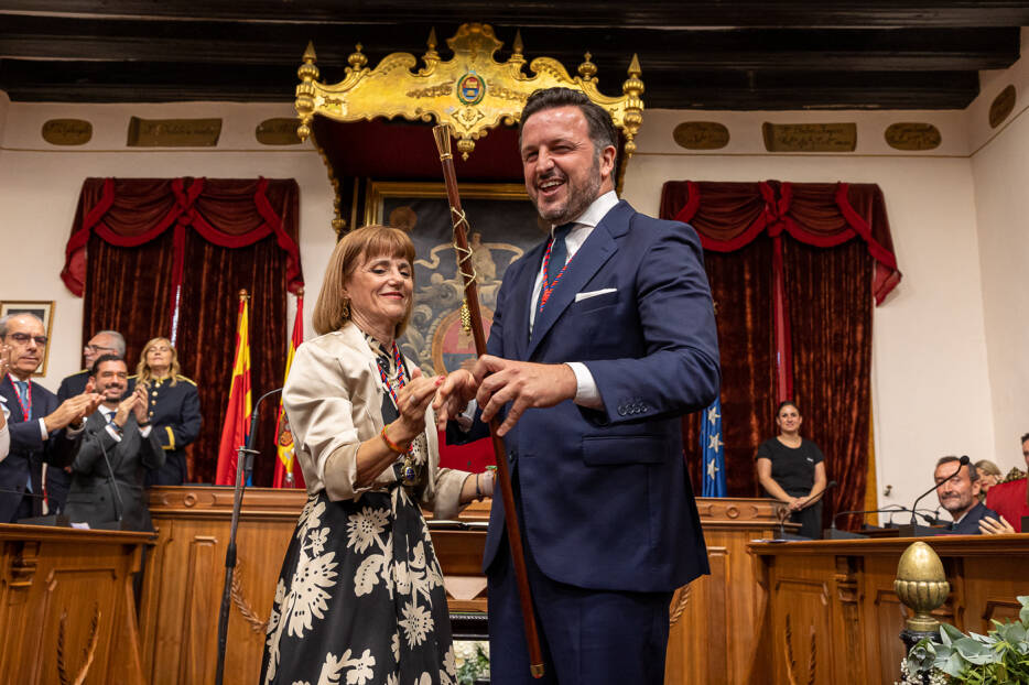 - La Presidenta de la Mesa de Edad, le hizo entrega del bastón de mando al recién proclamado alcalde.