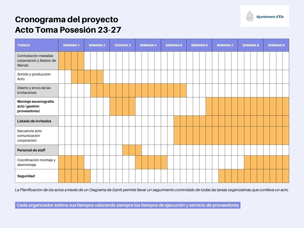 En mi opinión como imprescindible iniciar el acto con la contratación de las Medallas y Bastón de Mando, los tiempos de fabricación de las medallas y el bastón de mando junto con los períodos de tramitación administrativa es lo que más tiempo necesita.