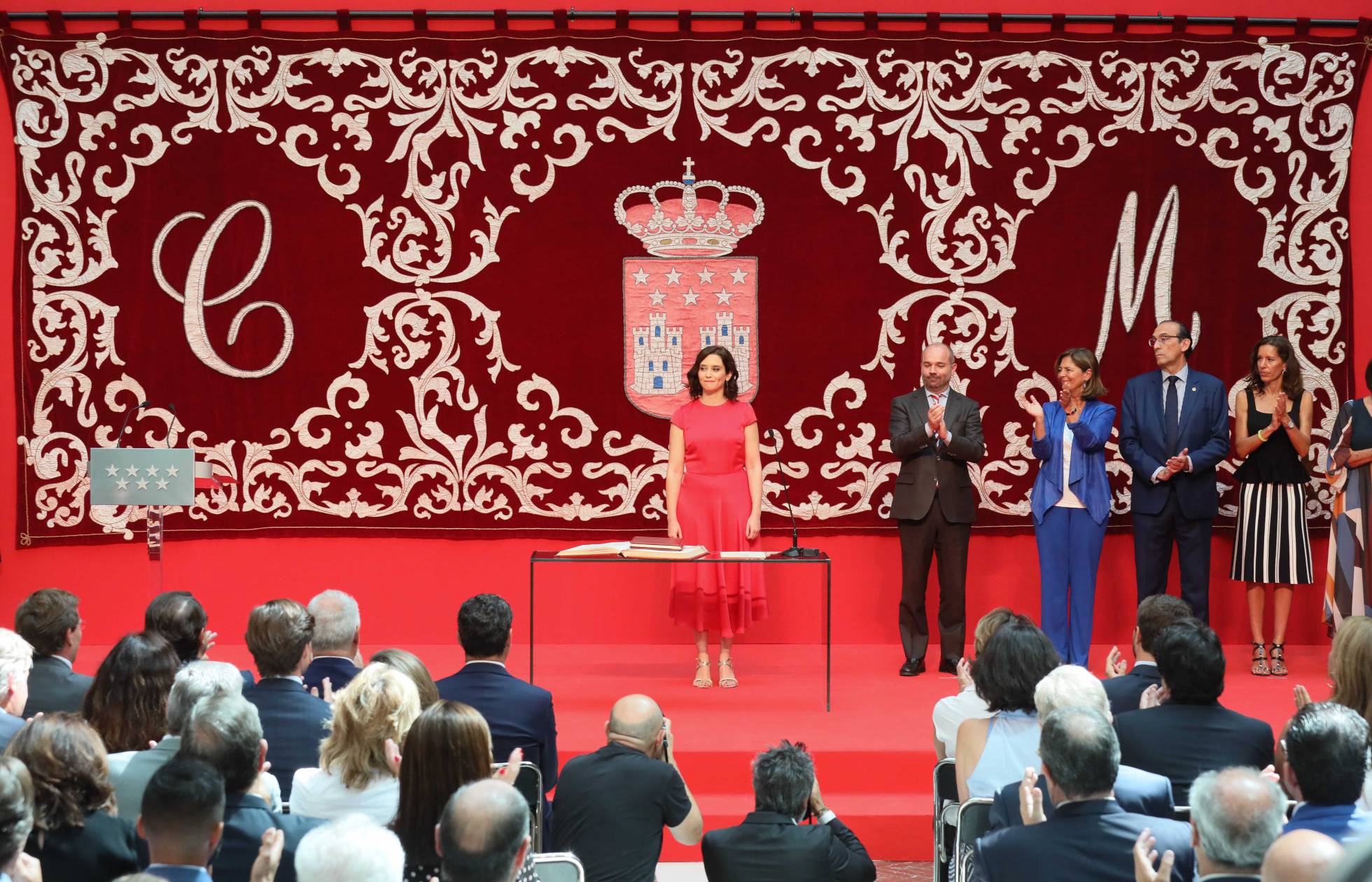 Me parece que una buena fórmula hubiera sido una mesa transparente, o un atril con líneas menos duras, donde los protagonistas estuvieran de pie, como este ejemplo en la Comunidad de Madrid para transmitir la cercanía que hacen gala los gobernantes de hoy en día.