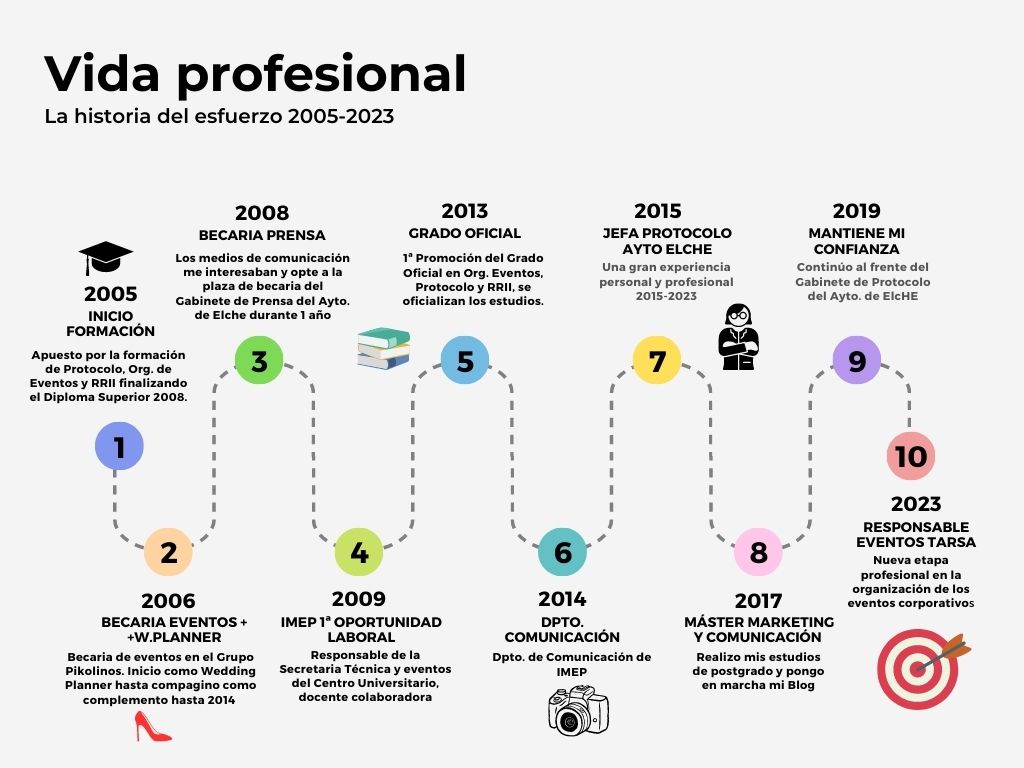 Como cierre de este artículo me gusta titular mi vida profesional como la historia del esfuerzo, un camino constante y de evolución donde ha primado siempre la fórmula de la Vocación, y que continuaré llevando a cabo para seguir cumpliendo mi sueño de cada mañana, ser organizadora de eventos.