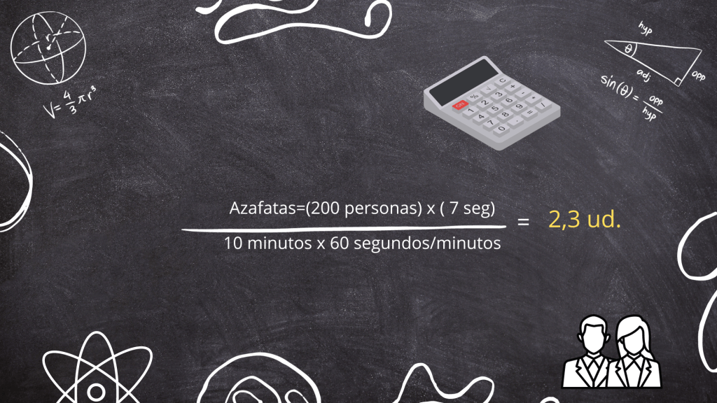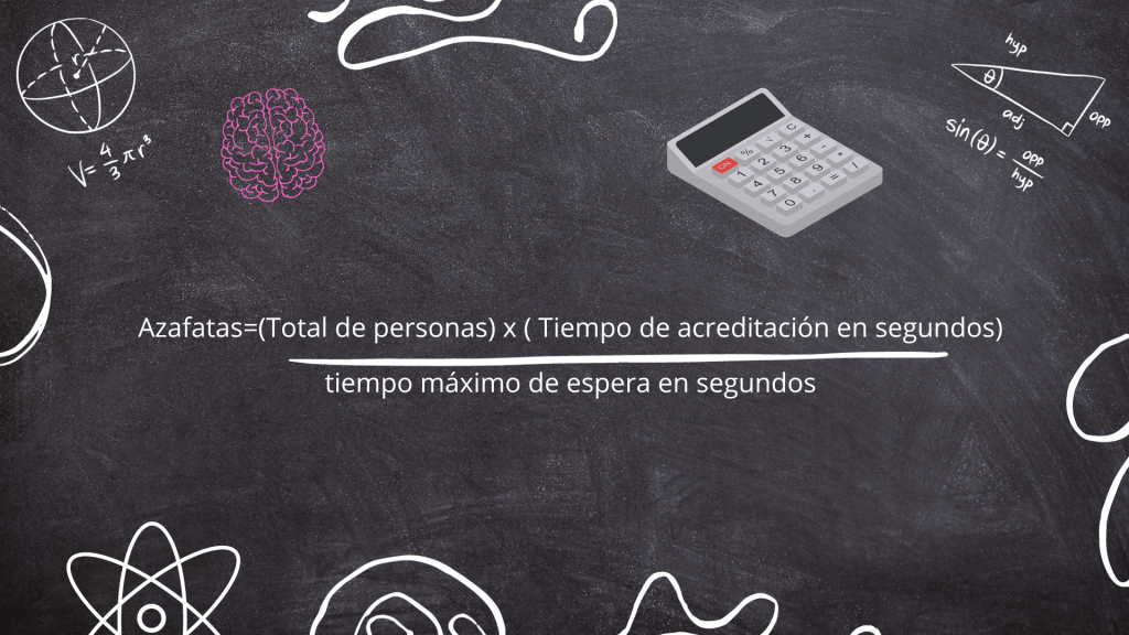 La siguiente fórmula, es interesante para valorar el número de personas que precisamos en cuestión de acceso al evento, para ello multiplicamos el número total de invitados por el tiempo aproximado que utilizaremos en la acreditación en segundos, y lo dividiremos por el tiempo máximo de espera en segundos que estamos dispuestos a que nuestros invitados asuman en actos de formato donde «todo el mundo llega a la vez».