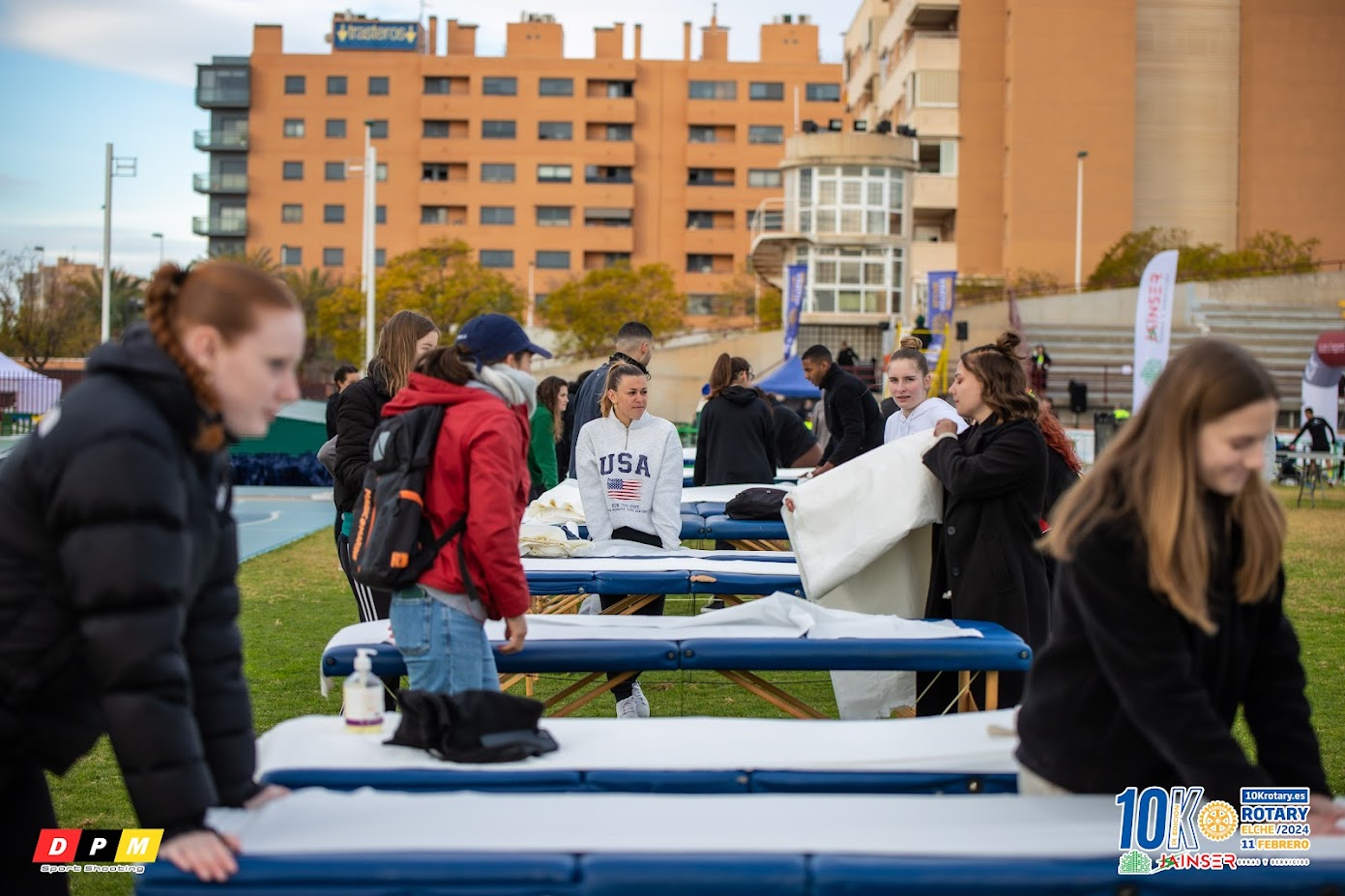 La zona de vestuarios,baños y guardarropa tiene que estar en óptimas condiciones asegurándonos que hay instalaciones y suministro para todos los corredores. Por descontado, el avituallamiento tanto durante la carrera, como a su llegada. En él debemos de prever bebidas energéticas, agua, fruta, barritas energéticas, alimentos y bebidas para que les hidraten y les recarguen las energías. Y por último, e igualmente importante, la zona de atención médica, en caso de que algún corredor requiera asistencia, en la 10K como puedes ver en imágenes esta zona se completo con la colaboración de los alumnos de fisioterapia de la universidad CEU que asistían a los corredores de posibles sobrecargas o lesiones provocadas durante la carrera.