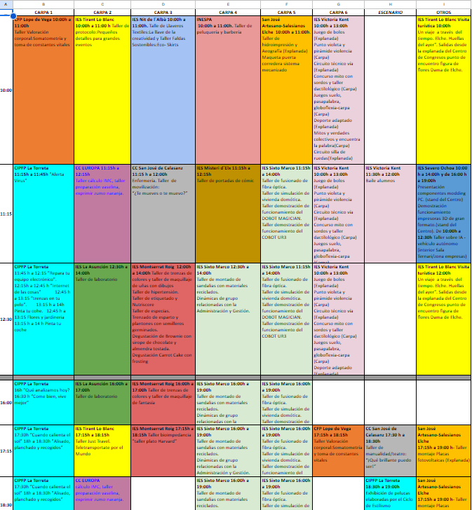 Para ello, se realizó una primer sondeo a todos los centros participantes, a través de llamada personalizada y concretando todo lo hablado por escrito.Una vez se dispuso de la información de aquellos que querían realizar talleres. Pasamos a la tarea más compleja ir asignando los horarios del modo más equitativo posible para formar ese cuadrante de colorines y tablas que comparto en la siguiente galería de imágenes.