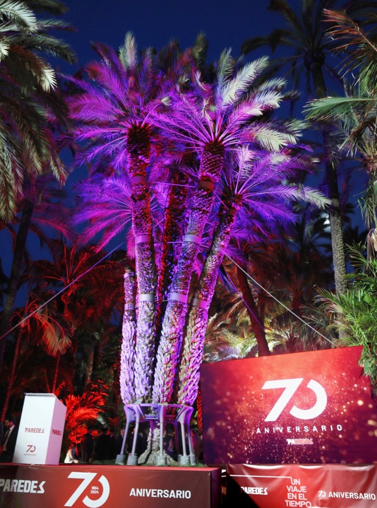 El Jardín Artístico Nacional del Huerto del Cura se convirtió en el narrador silencioso del evento. La gala se inició con la claridad de la luz natural, que inundó palmeras y buganvillas y realzó la majestuosidad de la Palmera Imperial con matices mediterráneos. Con el paso de las horas, tejimos de manera casi imperceptible una segunda capa lumínica —artificial y fiel a los colores corporativos— que, conforme se activaba, pintaba el jardín. Esta evolución gradual entre la claridad diurna y la paleta de la marca se fusionó con el entorno, otorgando al 70 aniversario de Paredes un sello visual espectacular y una atmósfera irrepetible.